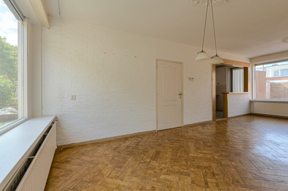 Woon/eetkamer afmeting circa 7.74 x 3.66 m, type doorzon met nette vloerafwerking en grote raampartijen aan de voor en achterzijde.