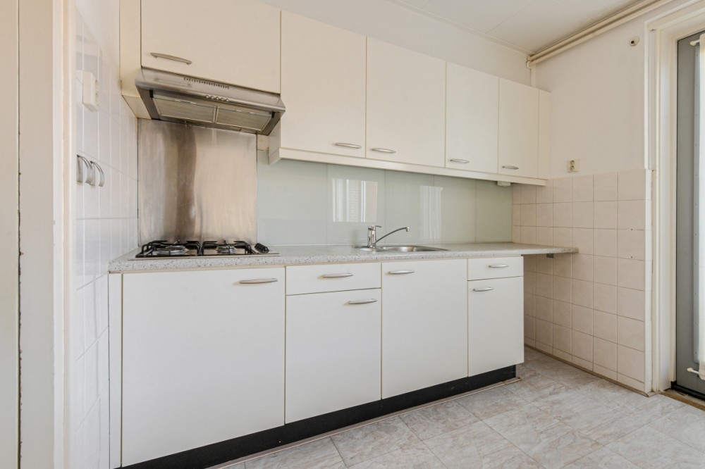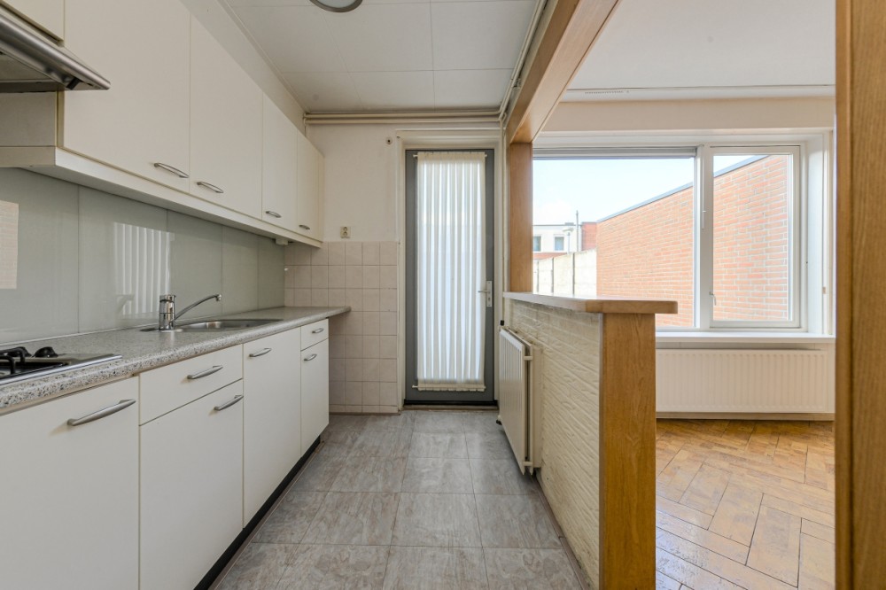 Half open keukenruimte afm. ca. 6.70m² met laminaatvloeren deur welkte toegang geeft tot de achtertuin. Het keukenblok is in een rechte opstelling geplaatst en beschikt over een spoelbak, 4 pits gaskookplaat, afzuigkap en diverse boven en onderkastjes.