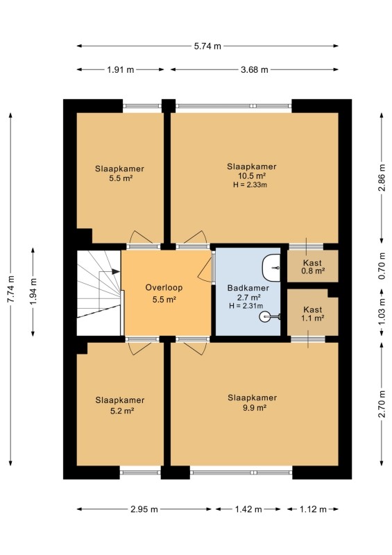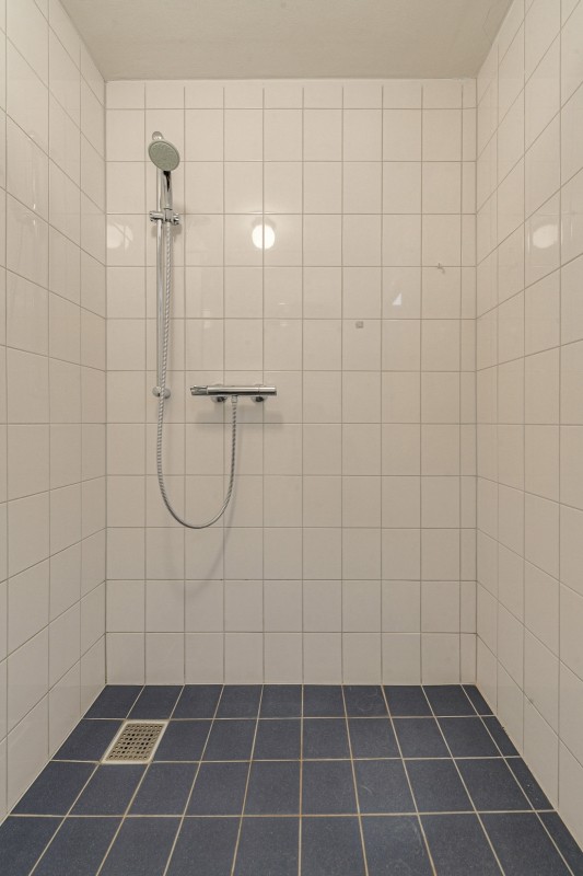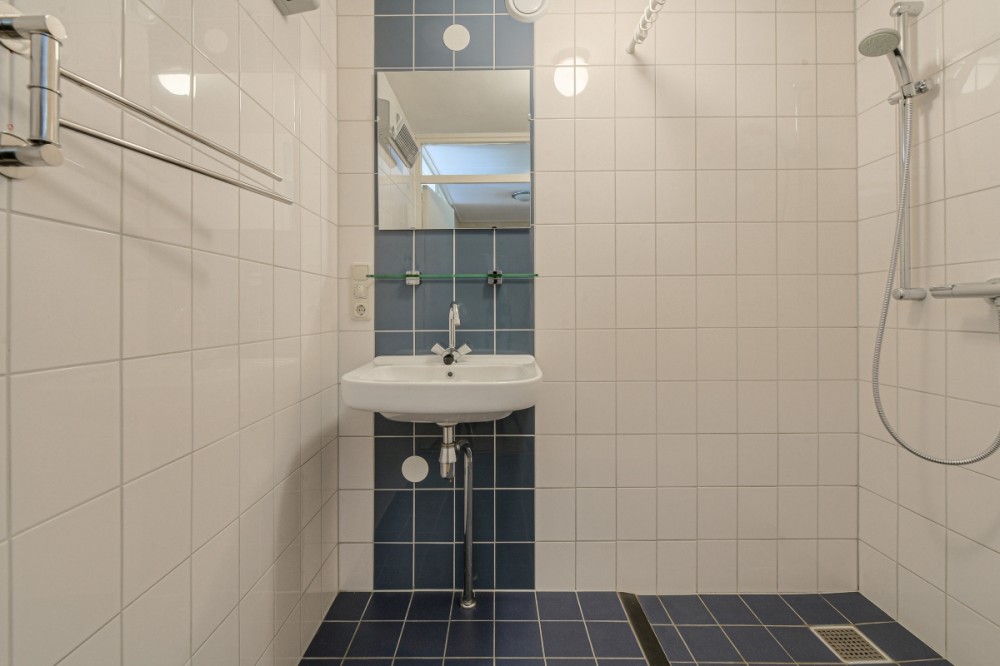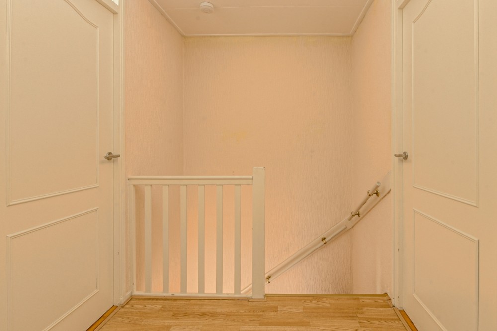 De overloop biedt toegang tot de vier slaapkamers en tot de badkamer. De badkamer is tot het plafond betegeld en voorzien van een wastafel en een inloopdouche. De eerste verdieping is vrijwel geheel voorzien van een laminaatvloer.