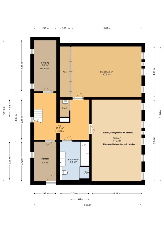Vanuit de overloop is de interne werkruimte/ berging (thans in gebruik als kantoor) aanwezig. Deze praktische werkruimte heeft een PVC-houtlook vloer en een plafondwarmtepaneel. De afmeting bedraagt ca. 4.00 x 2.00m.