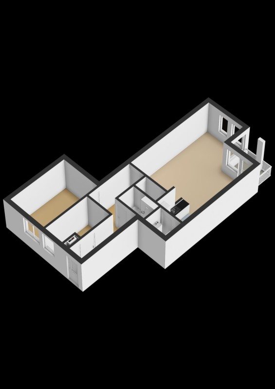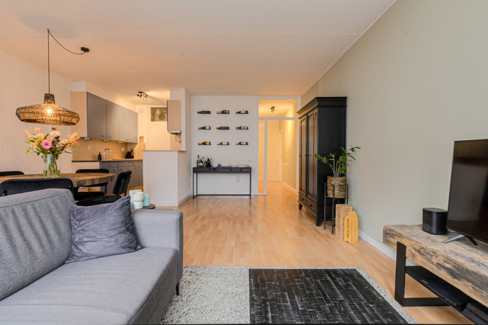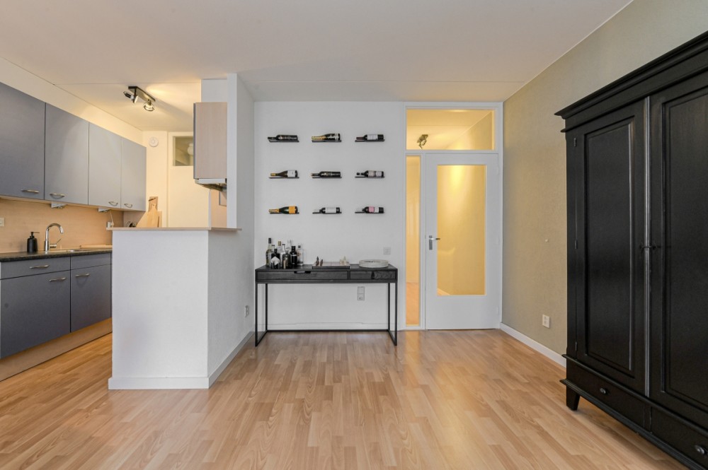 Aan de zuidzijde van dit appartement is de 'lichte' speelse woonkamer afm. ca. 6.44 x 4.97/2.68 m. gelegen, met nette laminaatvloer en spachelputz wanden. Vanuit de woonkamer is het balkon te bereiken welke op zuid/oost is gelegen.