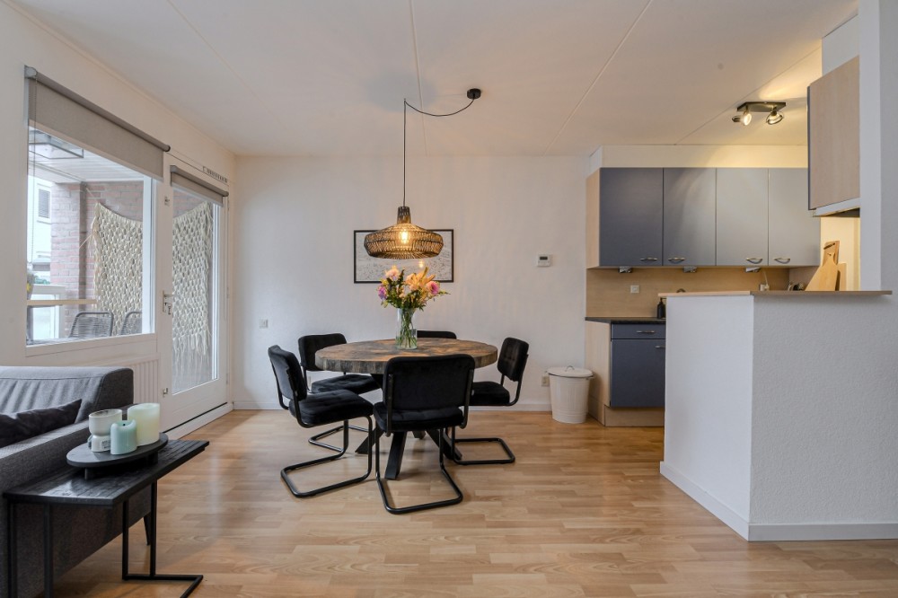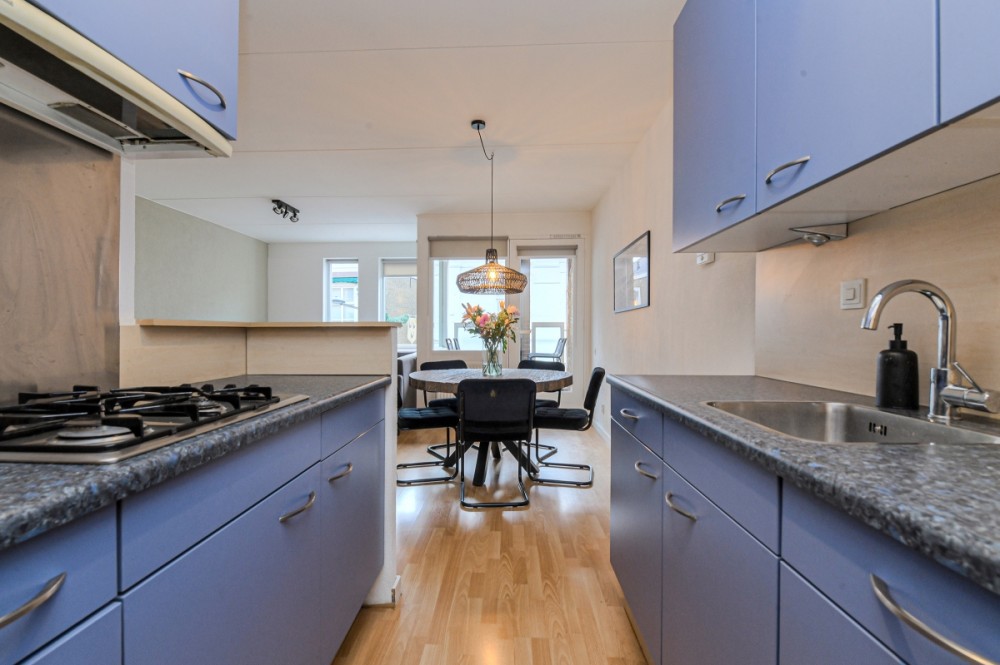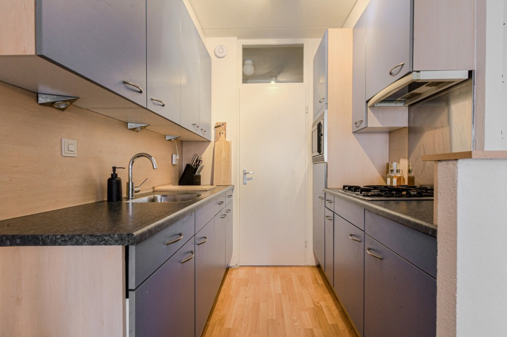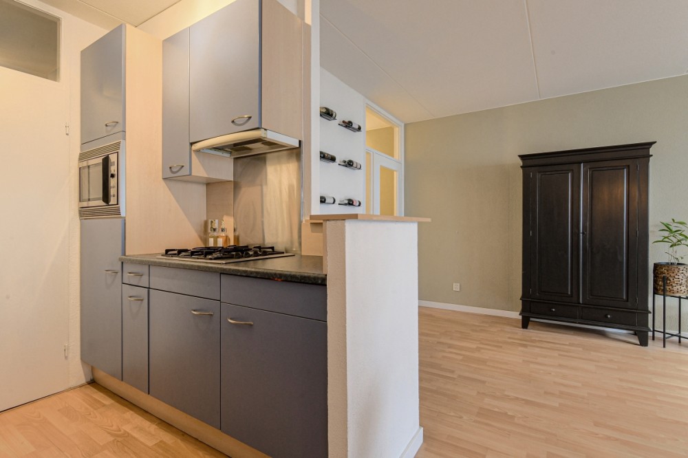 Half-open keuken met nette keukeninrichting voorzien van diverse inbouwapparatuur, te weten; 4 pits gaskookplaat, afzuigkap, vaatwasser, koelkast, vriezer, magnetron, ingebouwde verlichting en diverse kastruimte. Naast de keuken is een bijkeuken/cv ruimte gelegen, hier is de combiketel opgesteld alsmede de aansluiting ten behoeve van de wasautomaat aanwezig.