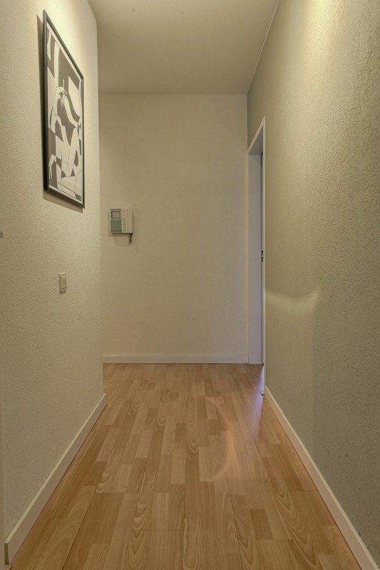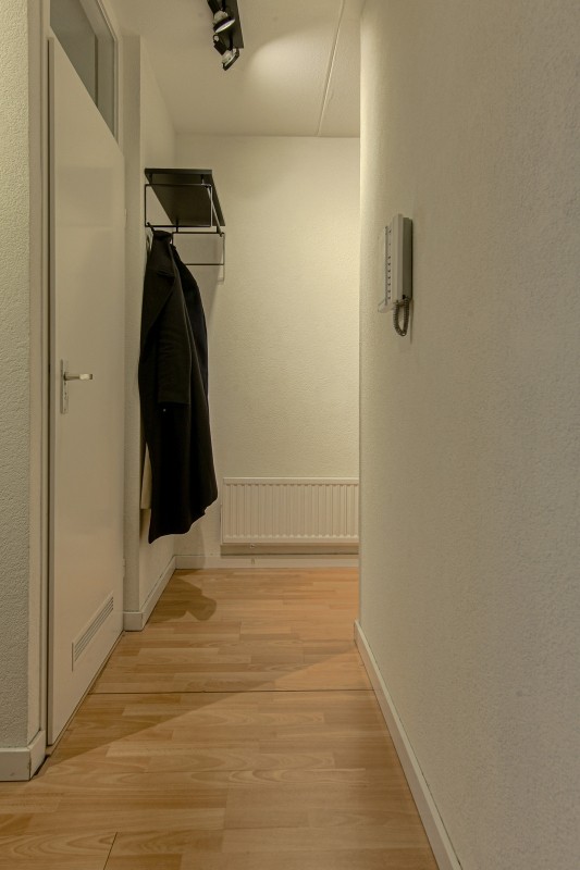 Hal met laminaatvloer, meterkast en intercominstallatie. Toegang tot de woonkamer en de 2 slaapkamers.