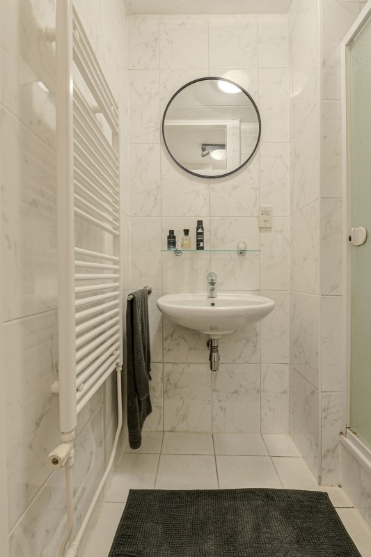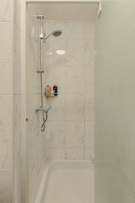 Badkamer eveneens betegeld tot plafond voorzien van douche en wastafel met spiegelkastje.
