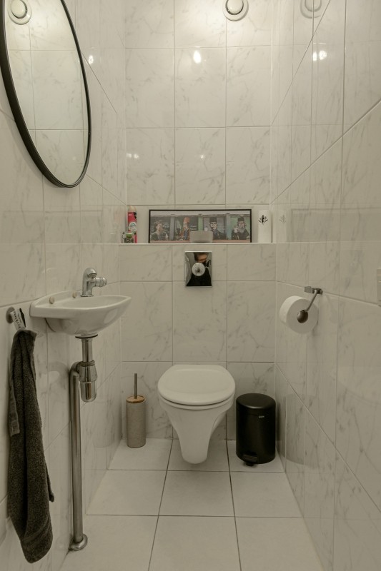 Separate toilet die tot plafond is betegeld is voorzien van een fonteintje.