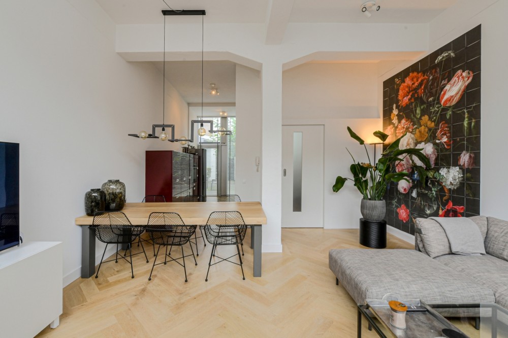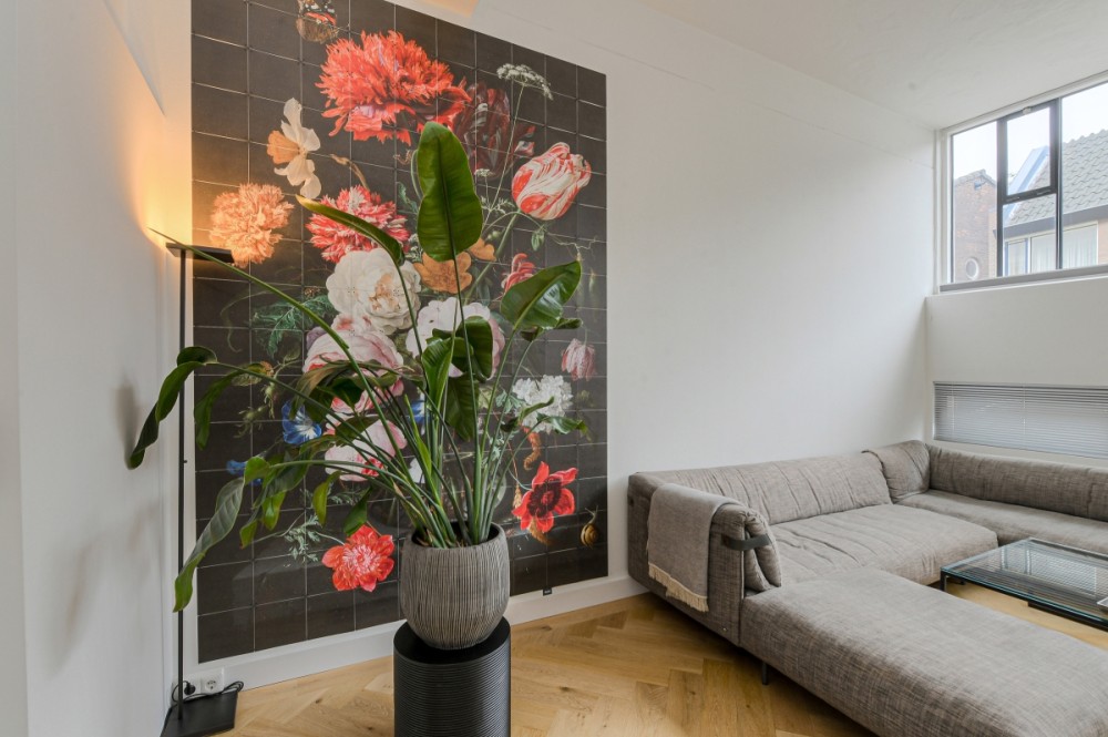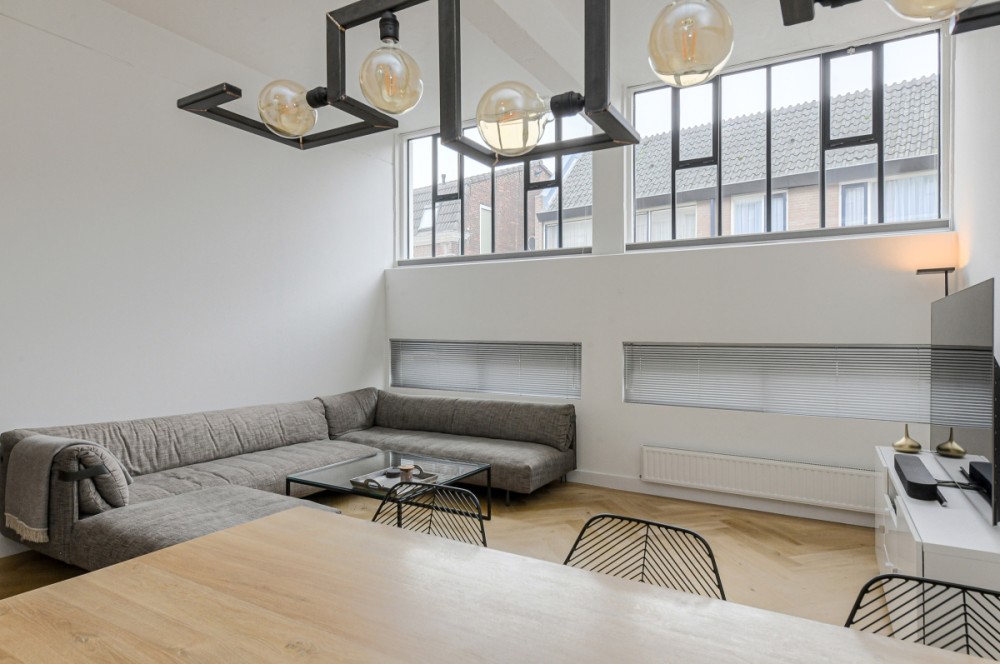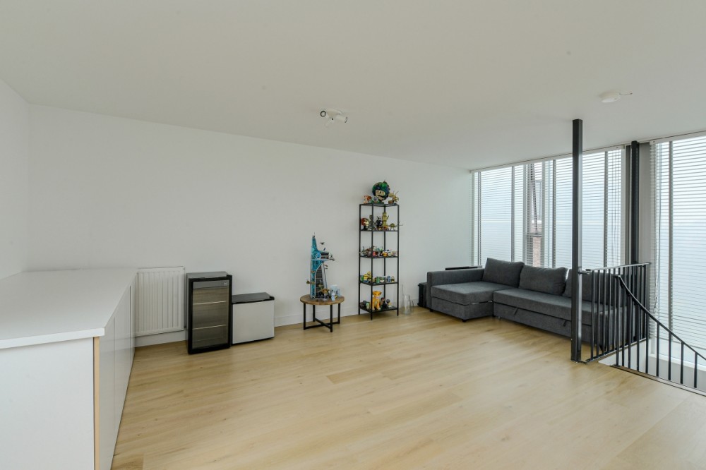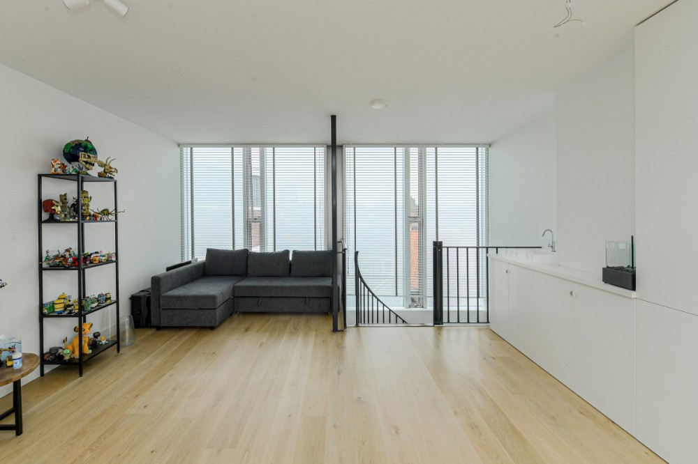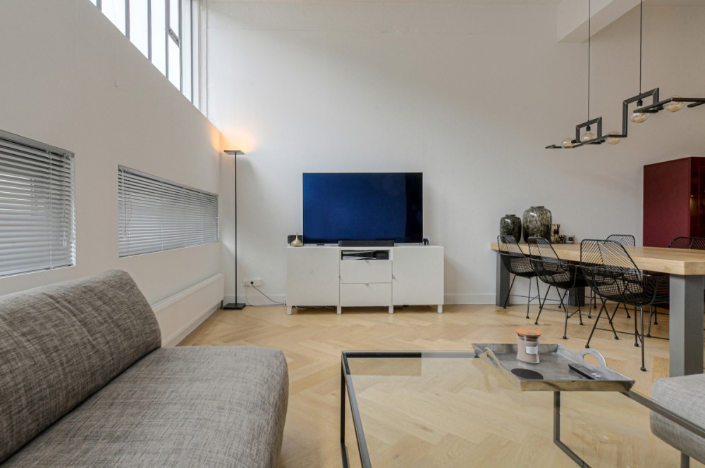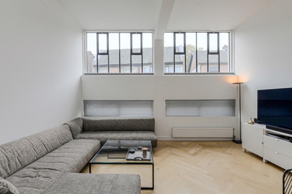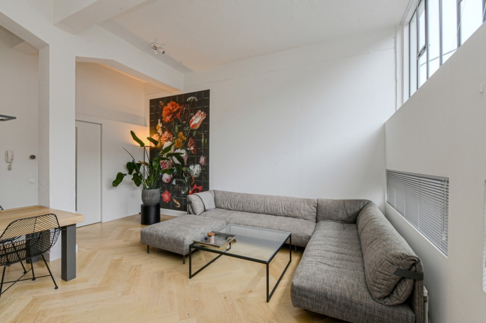 Royale living van ca. 30 m² met de oorspronkelijke hoge raampartijen, visgraat PVC vloer en oorspronkelijke betonconstructie in het zicht. Vanuit de living is de openkeuken te bereiken.