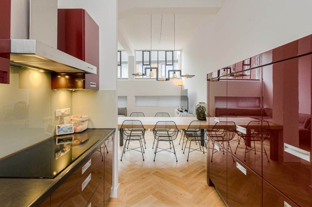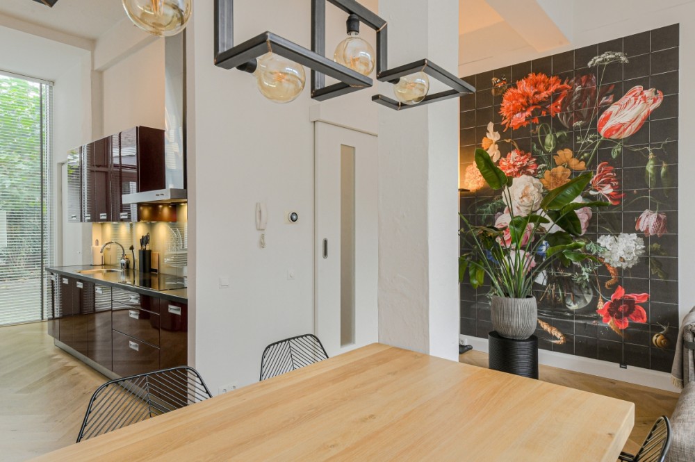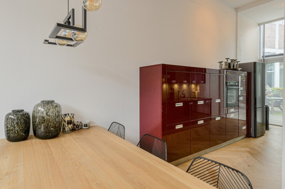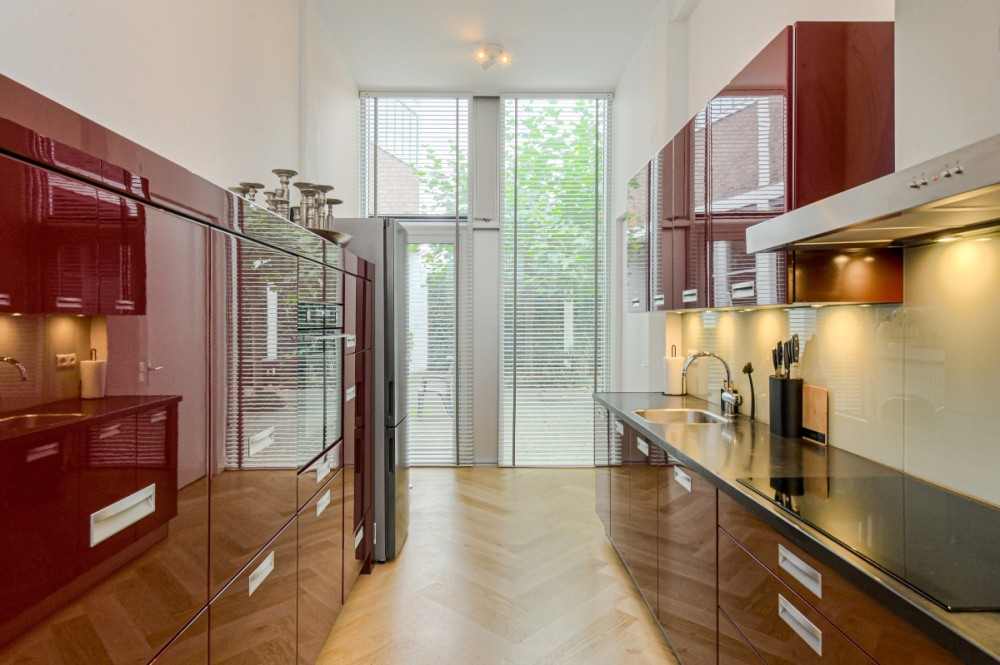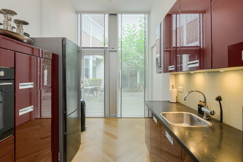 Riante openkeukenruimte met eveneens hoge plafonds, luxe design keuken met granieten aanrechtblad, voorzien van moderne led verlichting, keramische kookplaat, rvs-afzuigschouw, koelkast, heteluchtoven en vaatwasmachine. De keuken geeft toegang tot de hal en heeft een leuk zicht op de tuin.