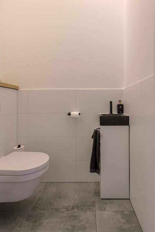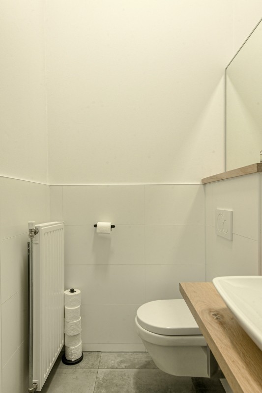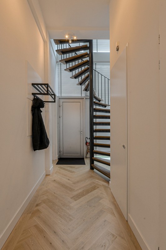 Entree/hal alwaar zich bevinden de meterkast, toiletruimte met wandcloset en fonteintje en wentelrap welke toegang geeft tot de eerste verdieping.
