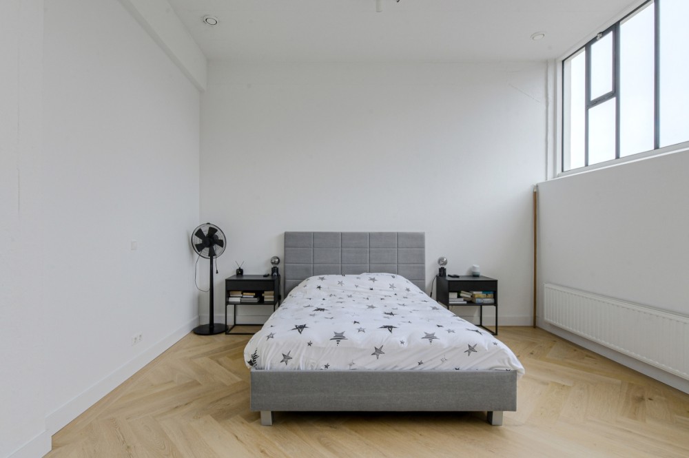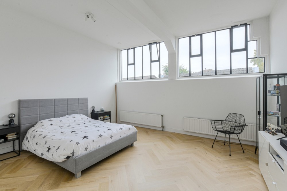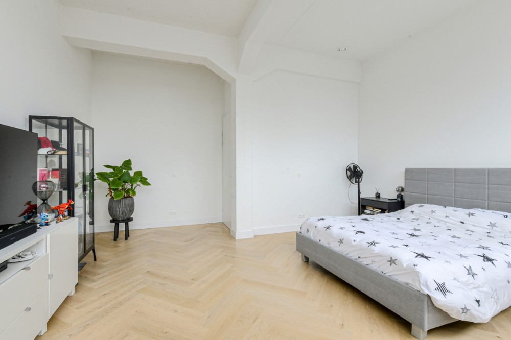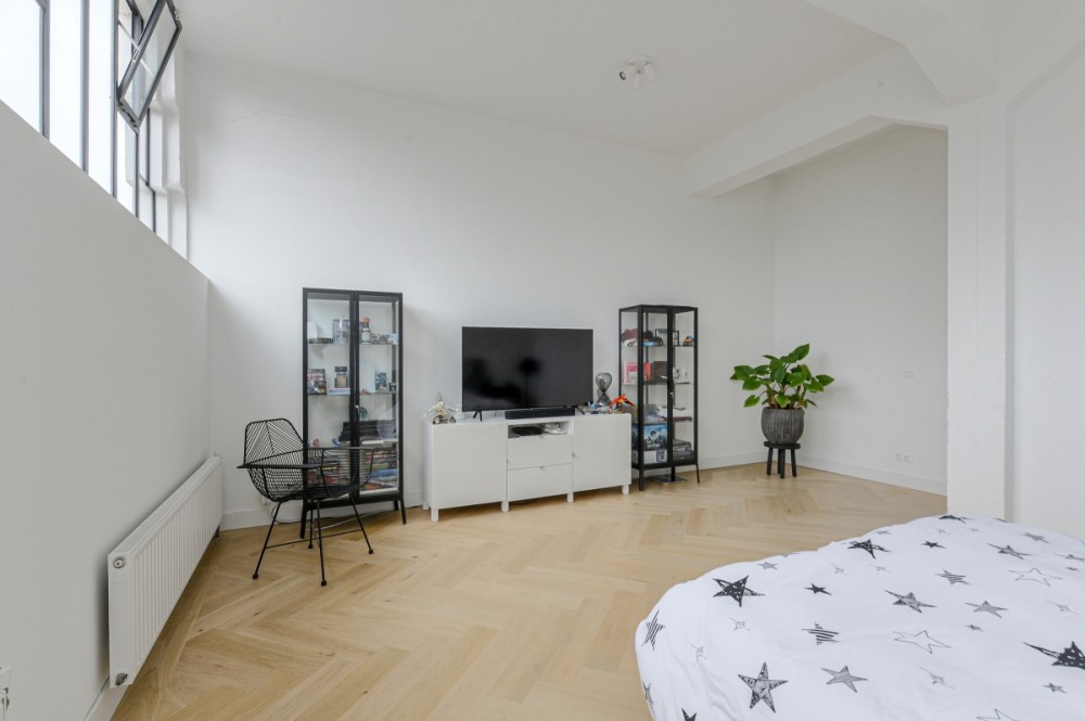Slaapkamer voorzijde afmeting circa 26 m². met hoge plafonds, grote raampartijen en visgraatparketvloer.