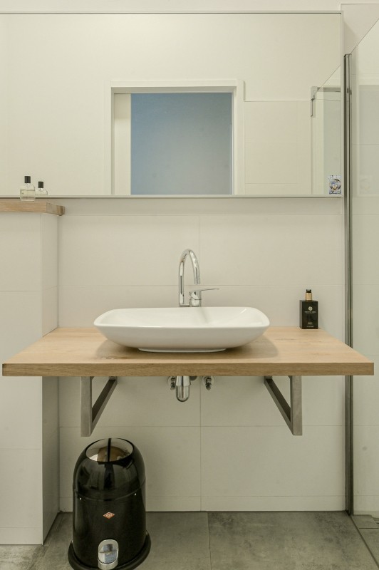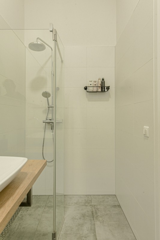 De betegelde badkamer, afmeting circa m. is voorzien van een inloopdouche, wandcloset en wastafelmeubel.