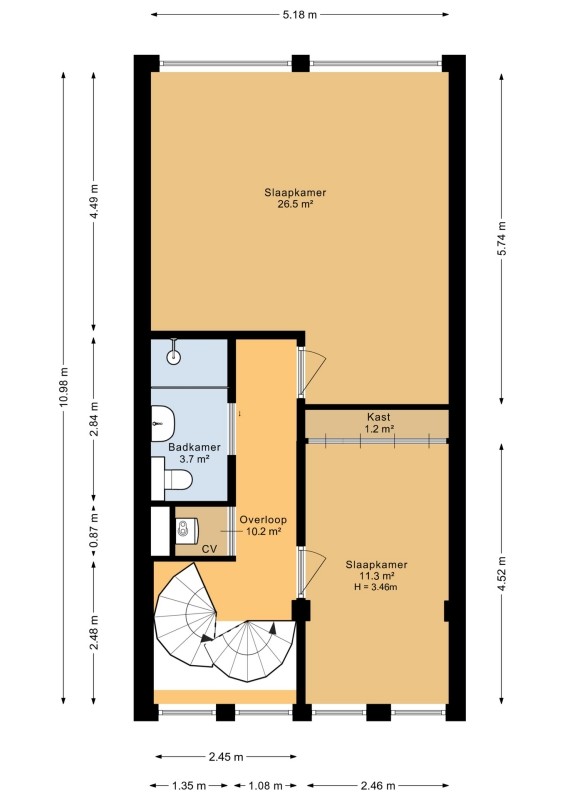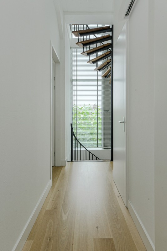 Middels vaste wenteltrap te bereiken, riante tweede verdieping van maar liefst 32 m² met schuifpui naar een royaal zonne-/dakterras van ongeveer 17 m² met een prachtig uitzicht over de daken van de wijk.