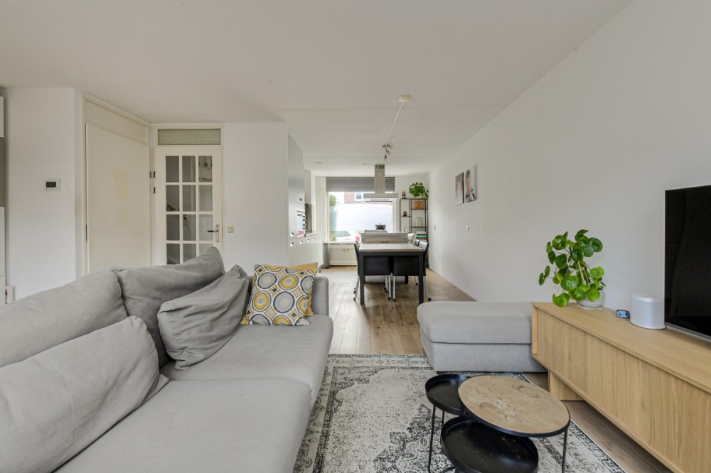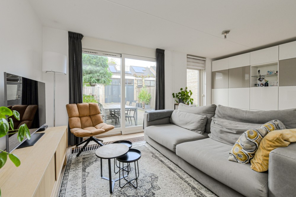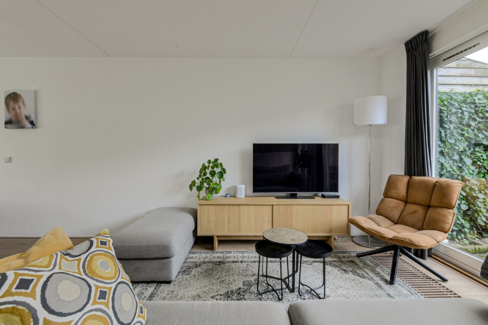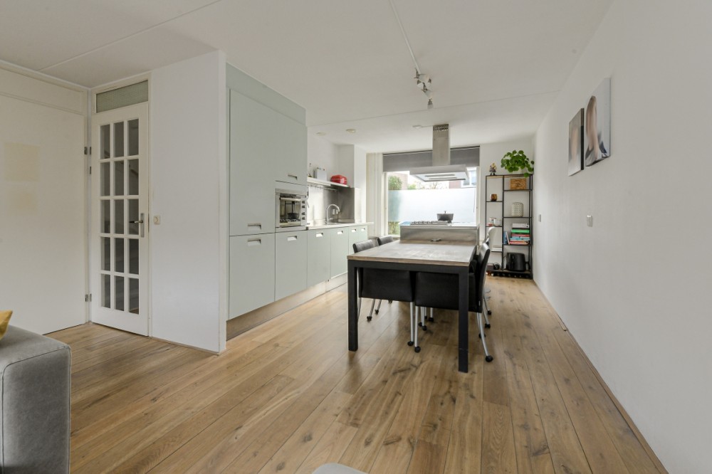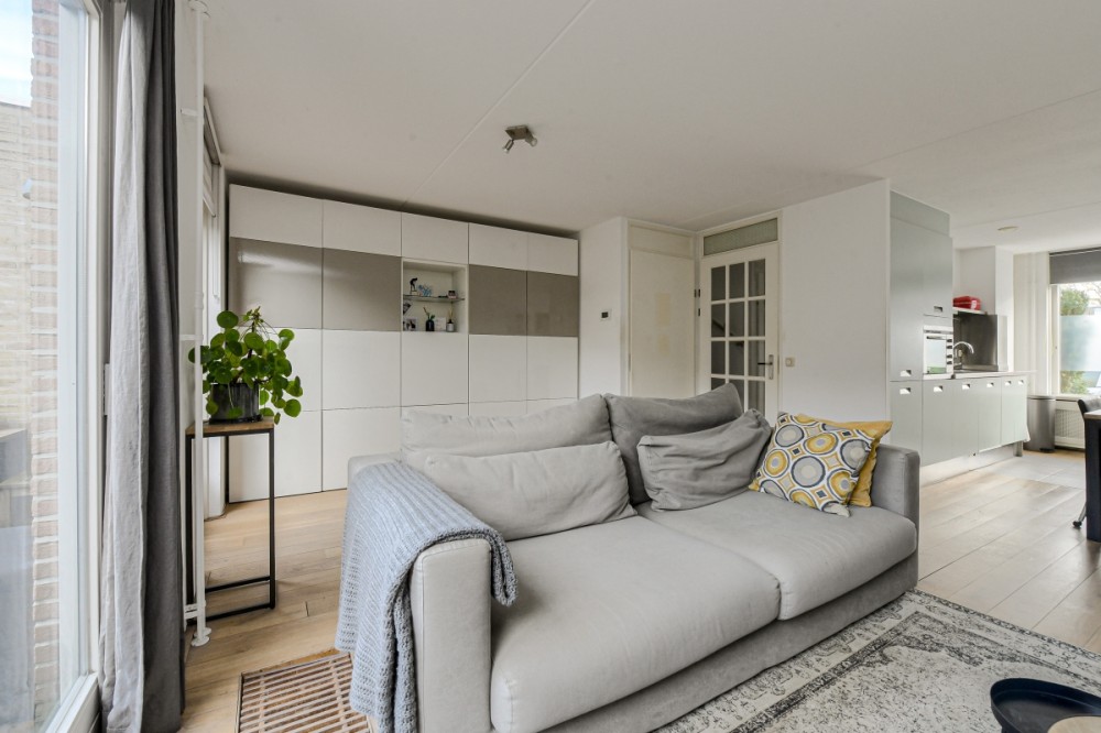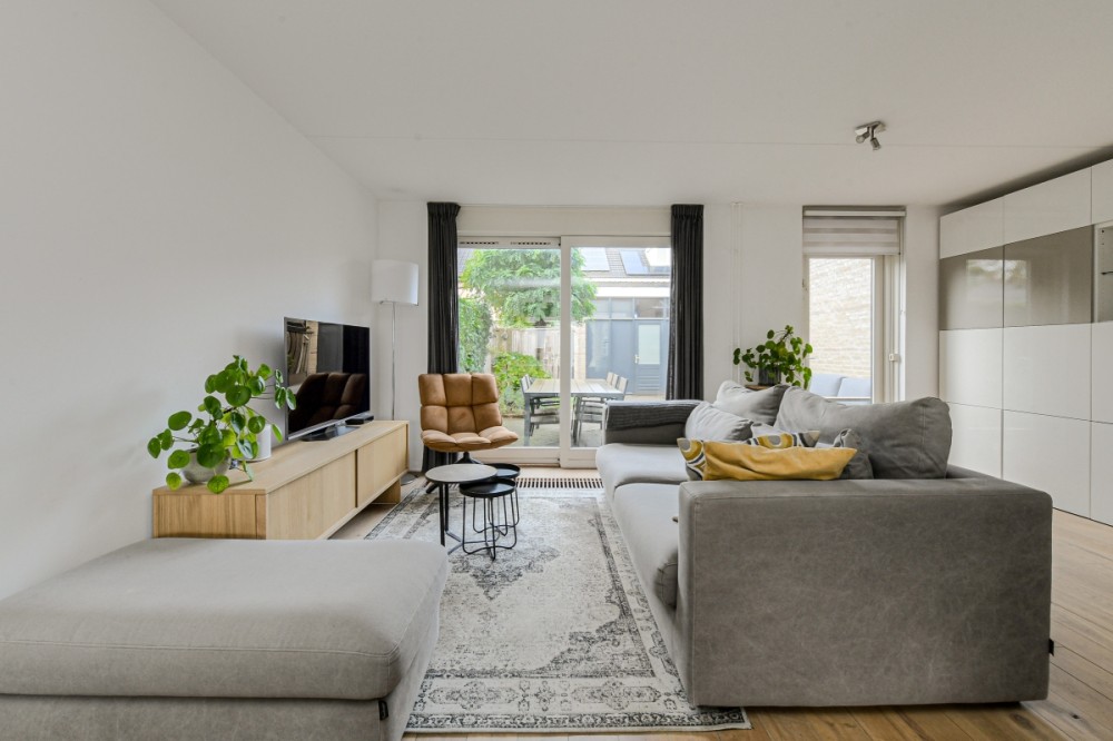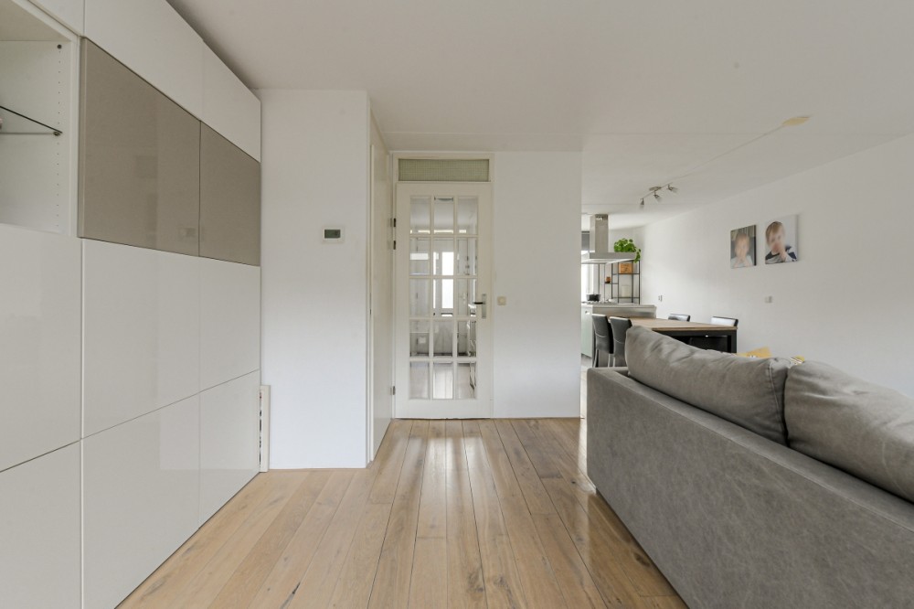 De tuin georiënteerde woonkamer afm. ca. 8.49 x 5.57m is eveneens voorzien van een eiken toplaag houtenvloer, bergkast onder de trapopgang, convectorput en schuifpui naar de tuin alsmede een loopdeur naar de tuin. Door de grote raampartijen is de woonkamer enorm licht te noemen.