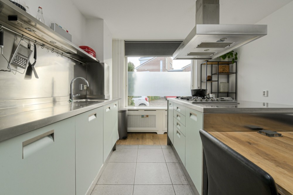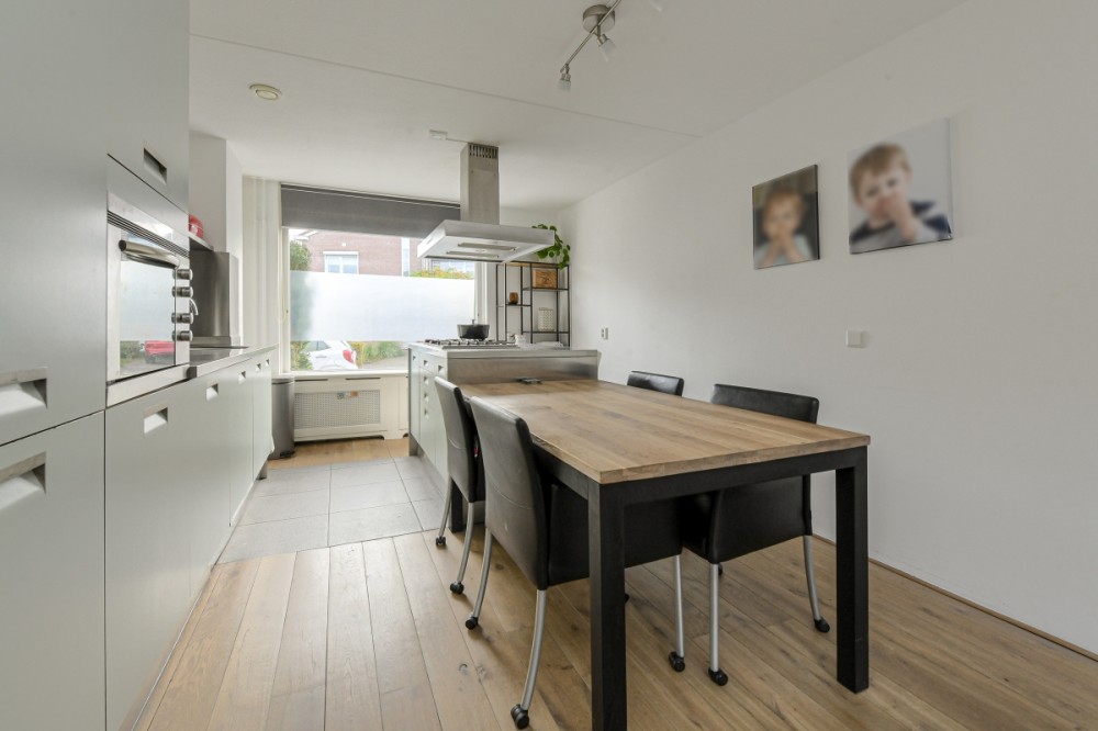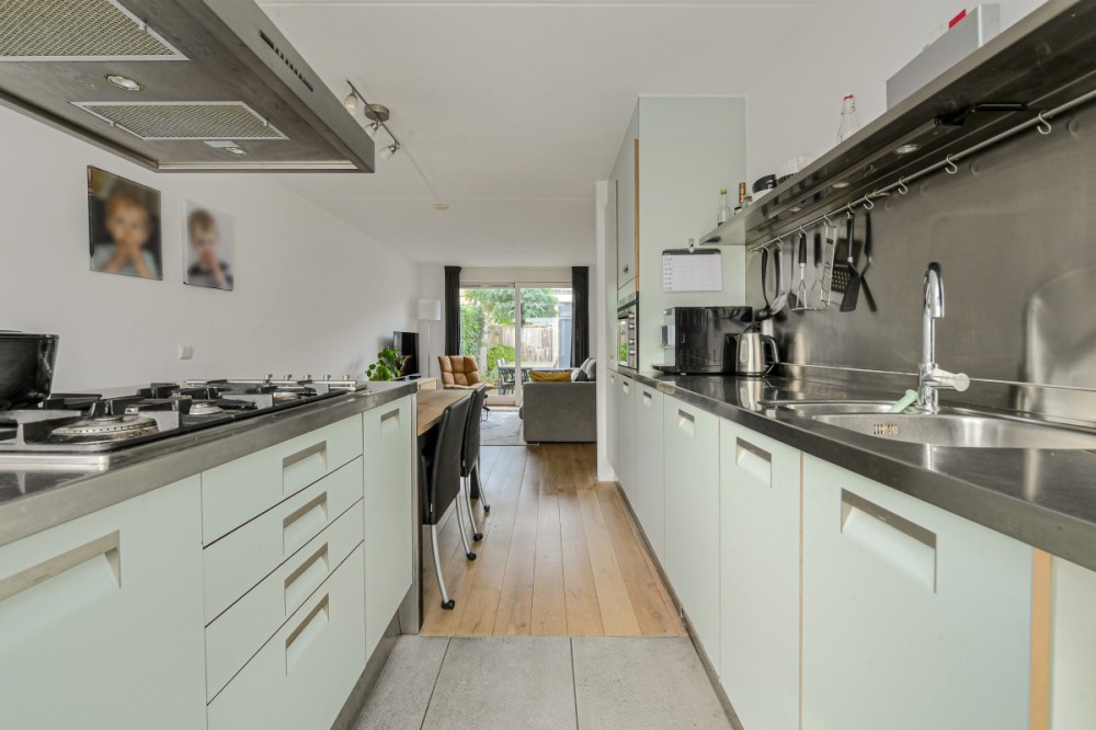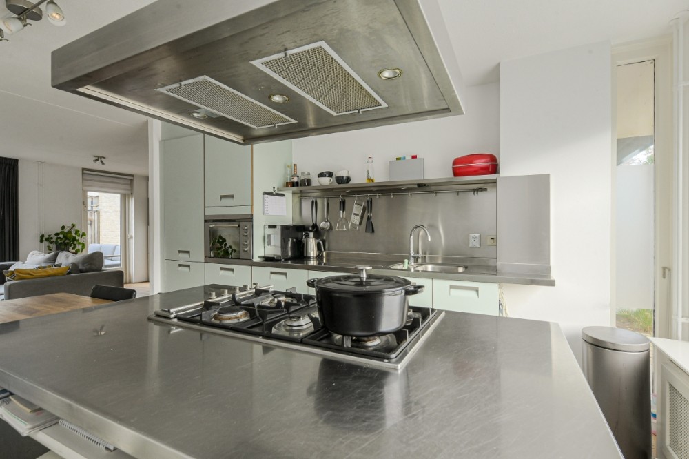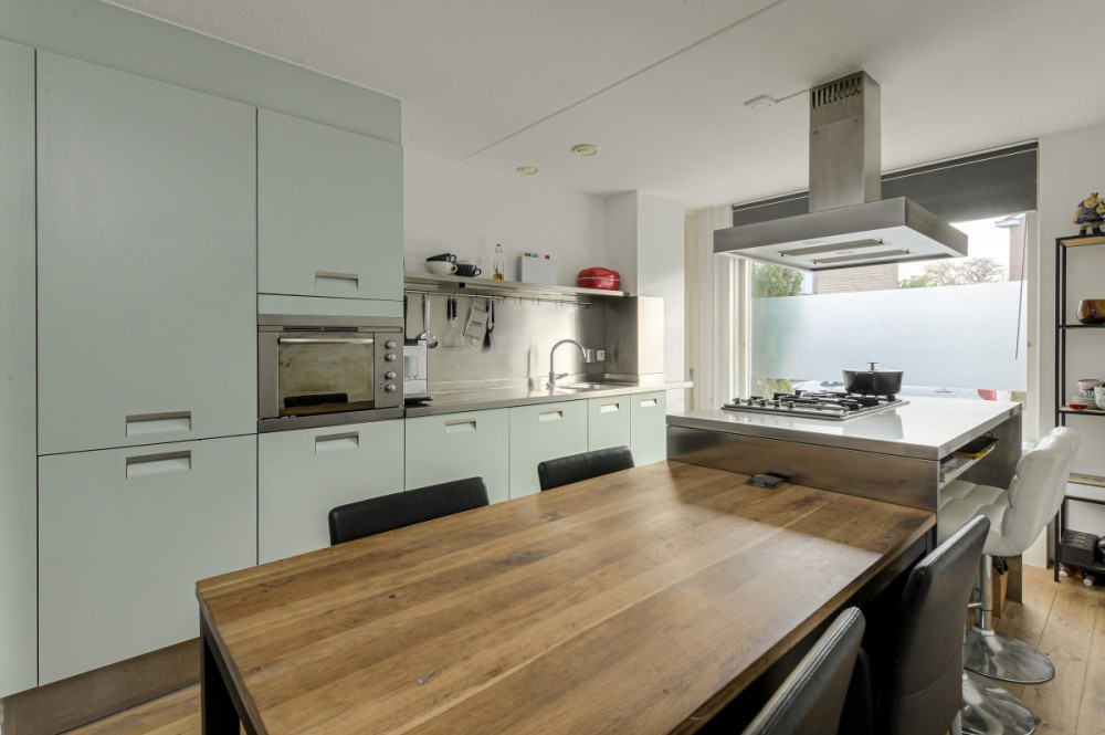 Open woon/eetkeuken, welke aan de voorzijde van de woning is gelegen met een nette keukeninrichting, in lichte kleurstelling uitgerust met rvs blad en diverse inbouwapparatuur, te weten; vaatwasser, 1,5 spoelbak, koel/vriescombinatie, combi-magnetron en apart kookeiland met 5 pits gaskookplaat, vrijhangende rvs afzuigkap, voldoende kastruimte en eetbar.
