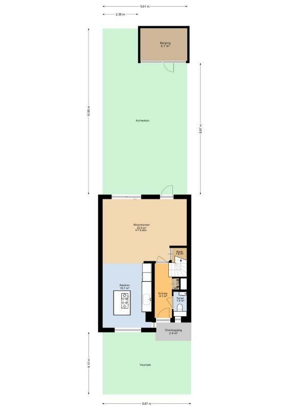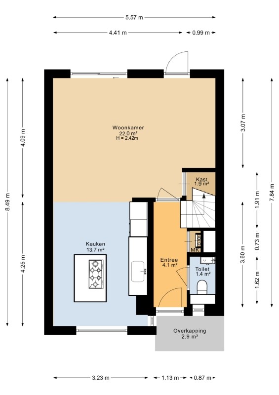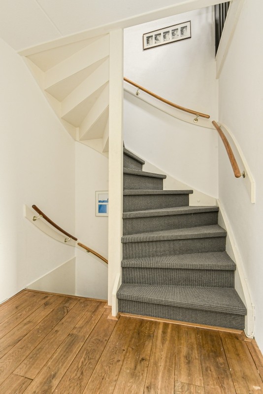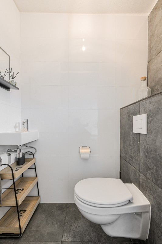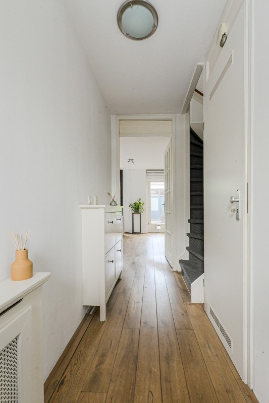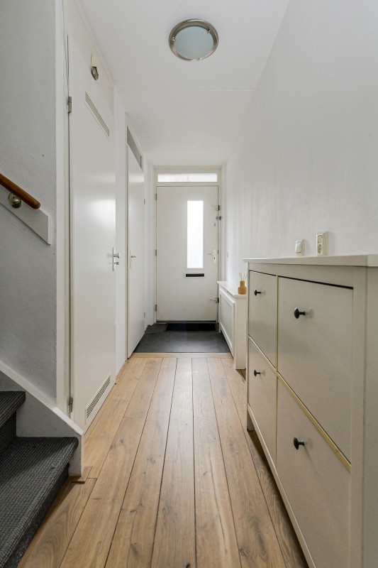 Entree/ hal welke is voorzien van een eikenhouten vloer, meterkast en volledig betegeld toilet met fonteintje. De trapopgang geeft toegang tot de eerste verdieping.