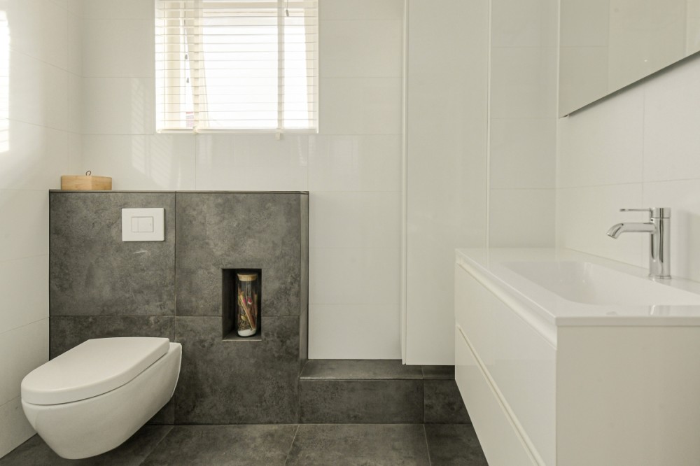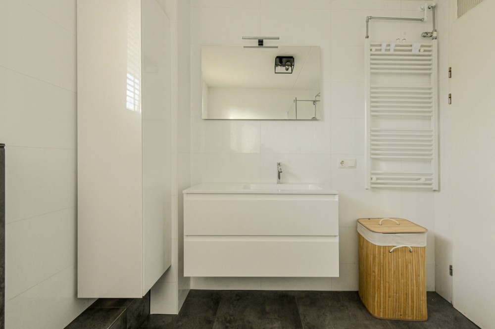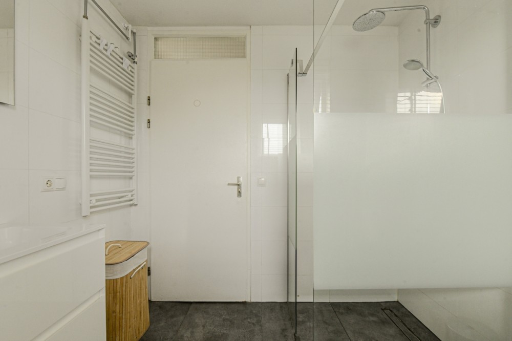 Recent vernieuwde badkamer welke is voorzien van een inloopdouche, twee persoonswastafel met meubel, tweede hangcloset en design radiator.