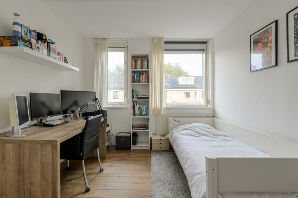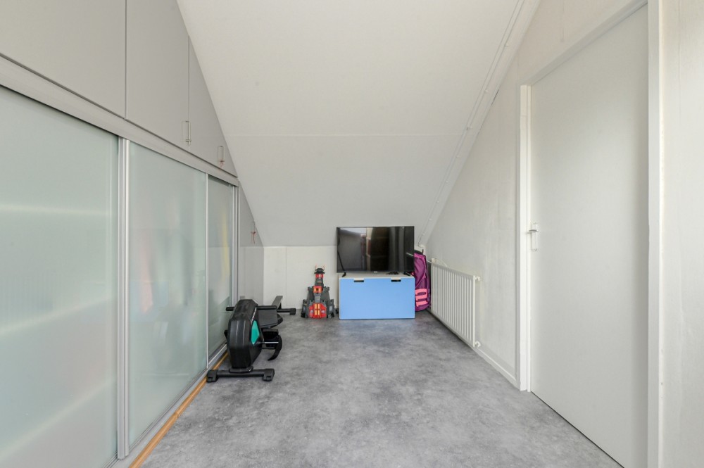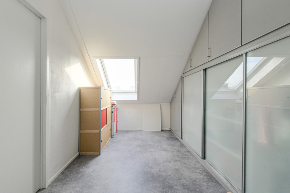 Vanuit de voorzolder is de zolderslaapkamer afm. ca. 8.1 m² bereikbaar met linoleum vloer, vaste kastenwand, een groot Velux dakraam en bergruimte achter de knieschotten.