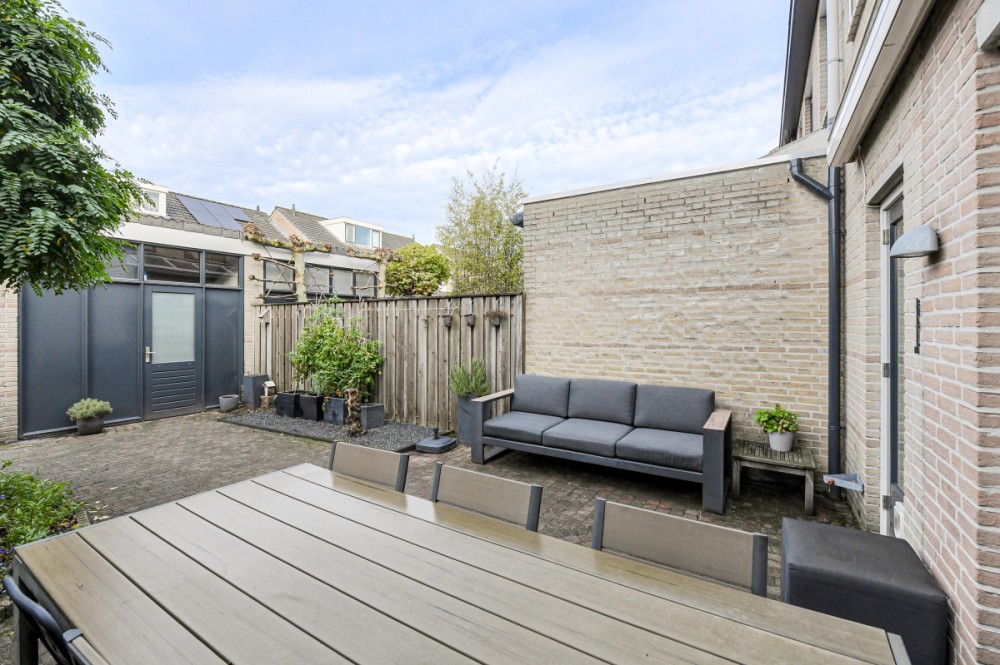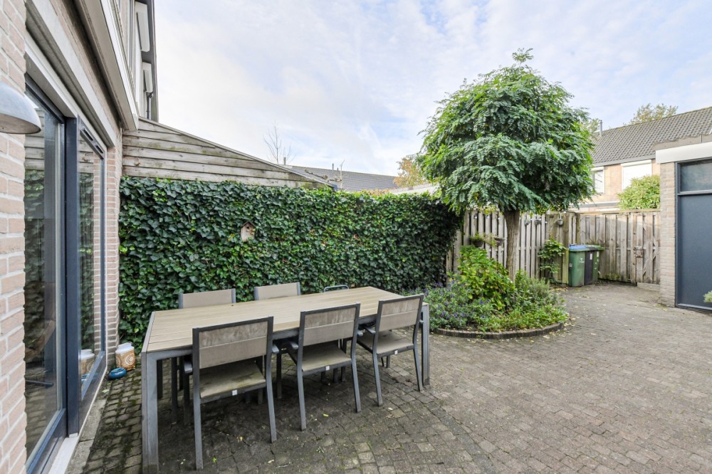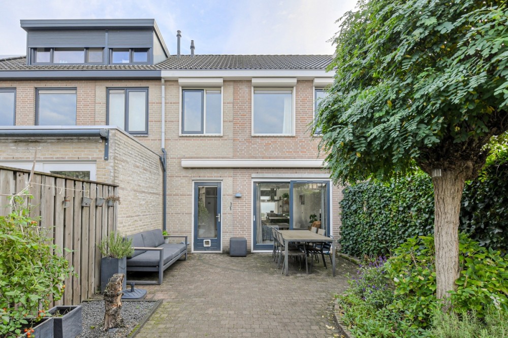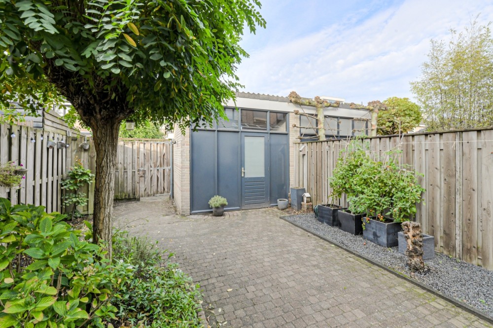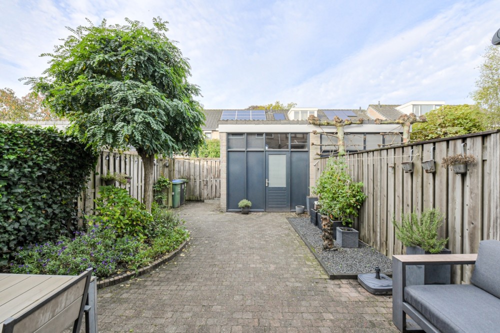 Circa 11 meter diepe achtertuin, welke op het westen is gelegen met volop privacy. De tuin is keurig aangelegd met diverse borders met beplanting, terras en tuinberging welke voorzien is van elektriciteit. Tevens is er een achterom aanwezig. De achtergevel is voorzien van een elektrisch zonnescherm.