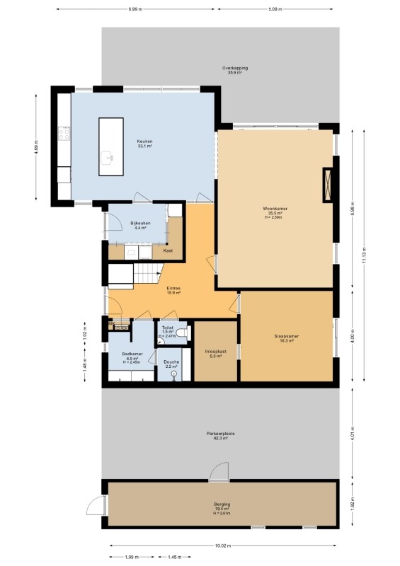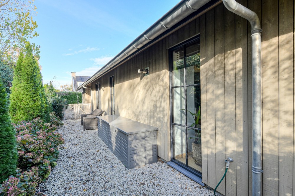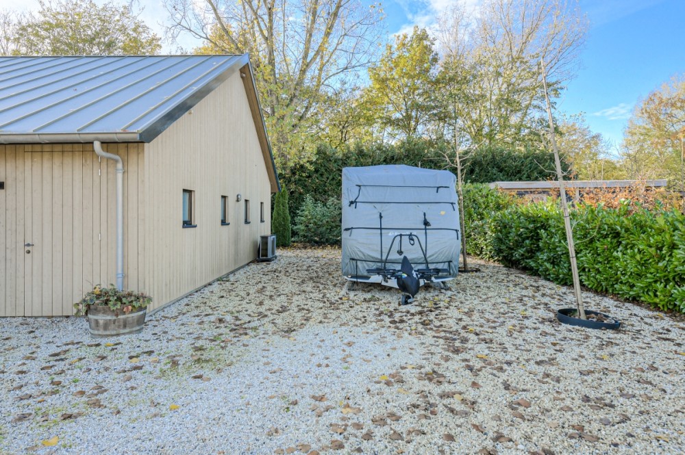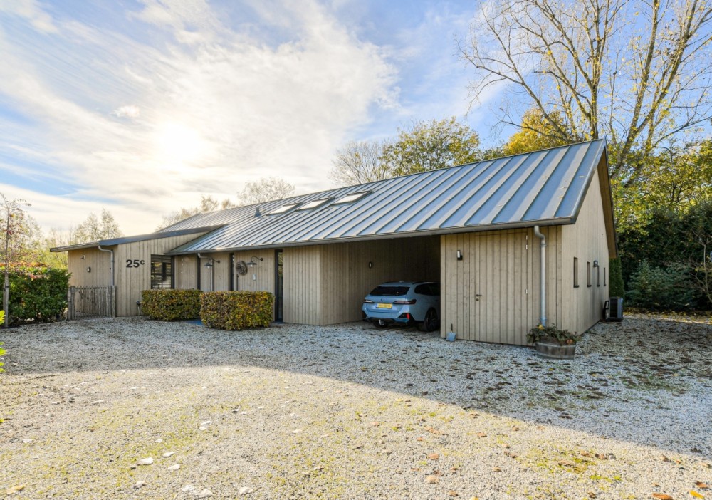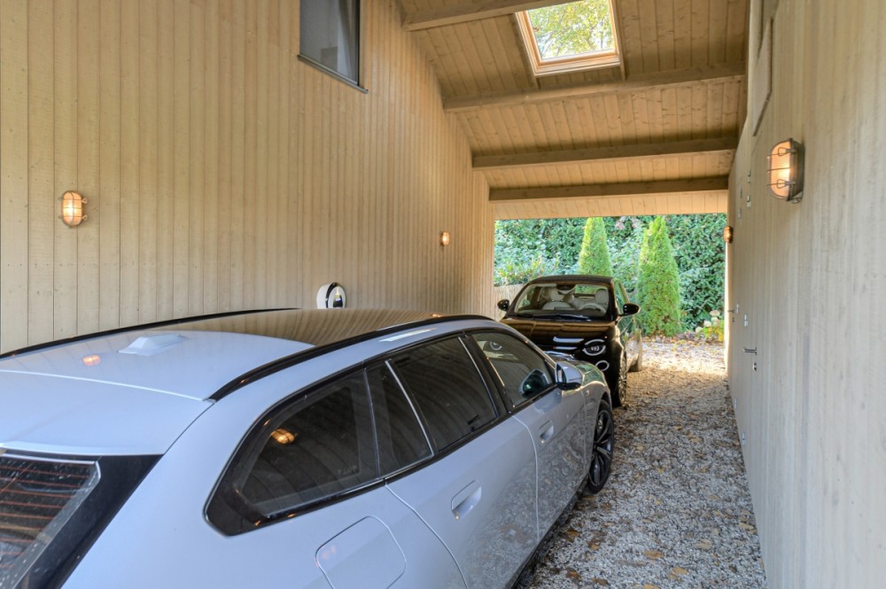 Via de oprit bereikt u de luxe carport voor twee auto’s met laadmogelijkheid. Direct aangrenzend vindt u een ruime en praktische berging, ideaal voor fietsen, tuingereedschap of extra opslag. Aan de linkerzijde van de carport, bevindt zich tussen de beukenhagen de voordeur van de woning.