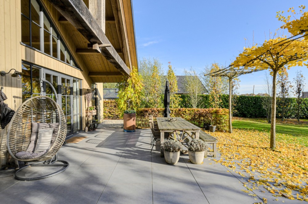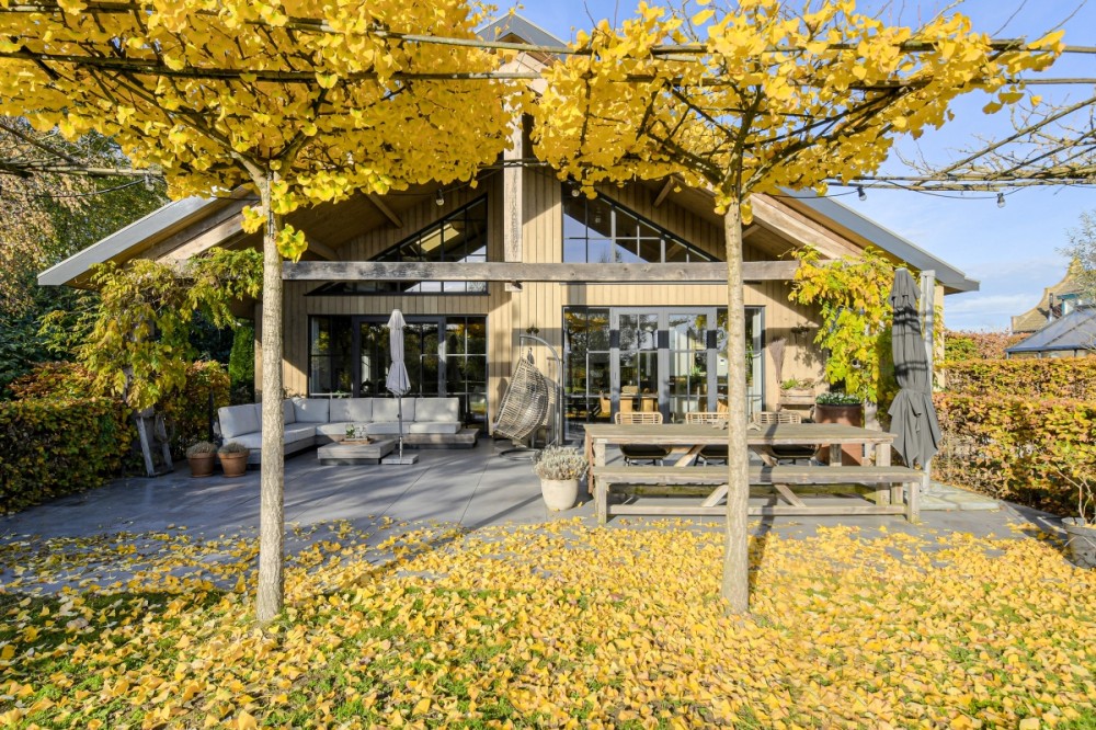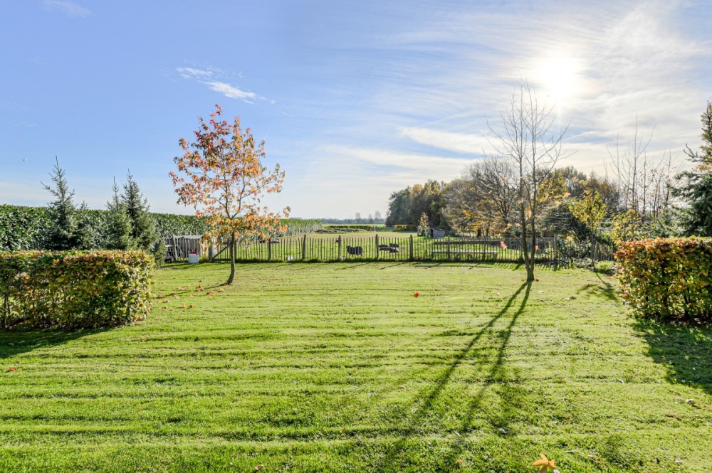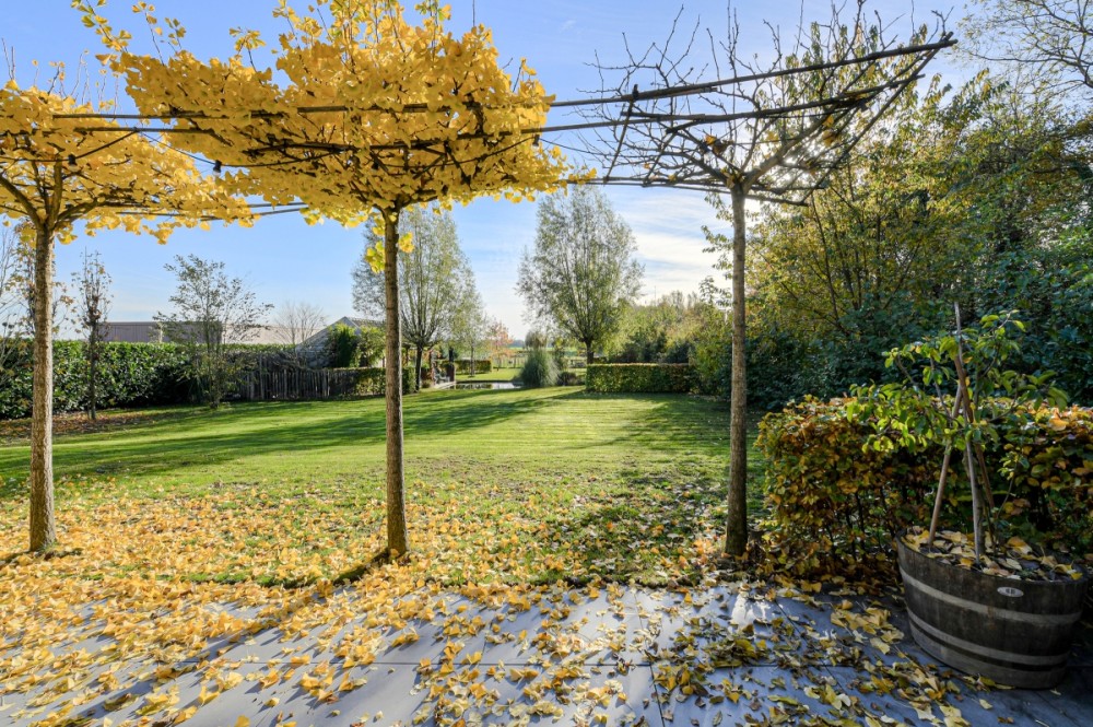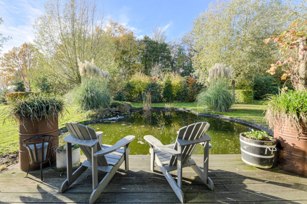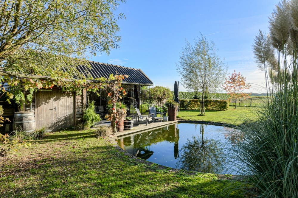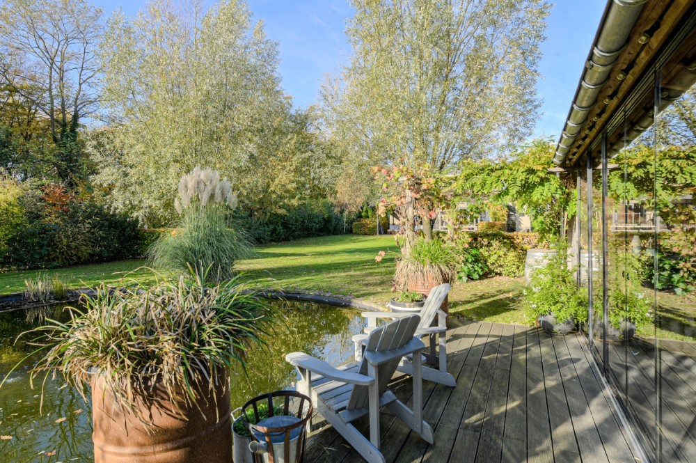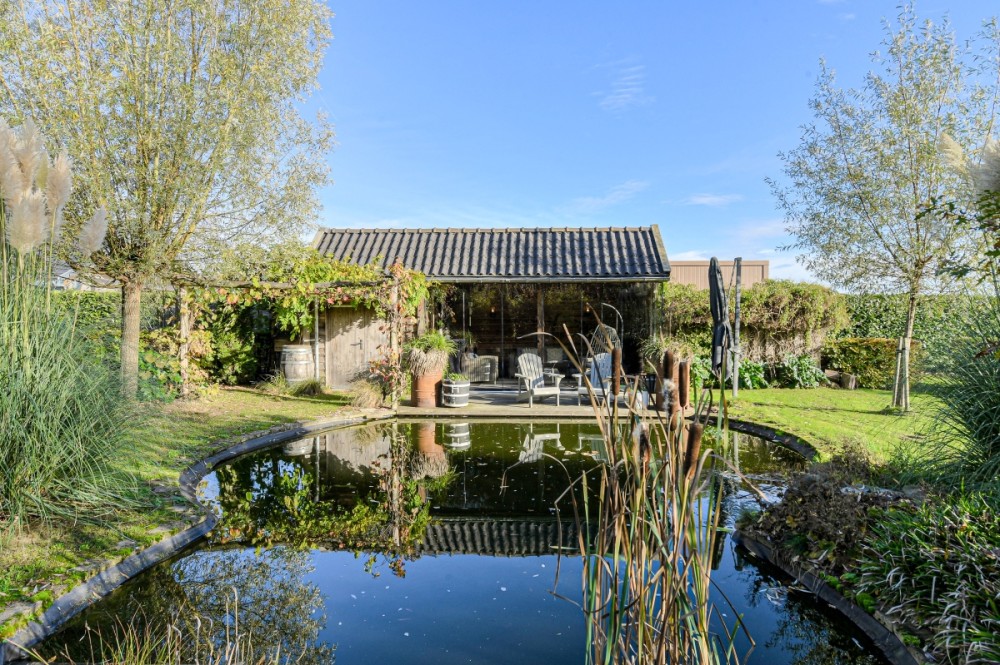 Buiten vind je een tuin die gemaakt is om te genieten: gazon, vijver, overkapping, volwassen beplanting, een weide en een vrijstaand tuinhuis met glazen schuifpanelen.. Hier wordt het buitenleven een natuurlijk onderdeel van elke dag.
