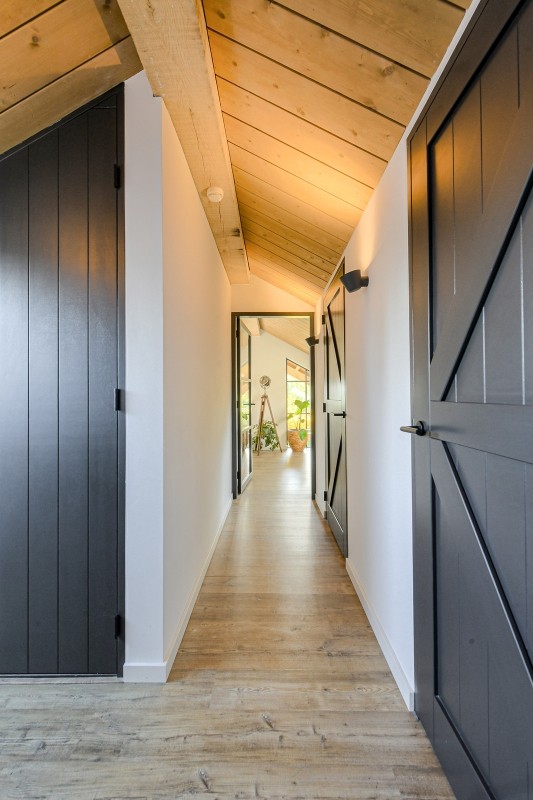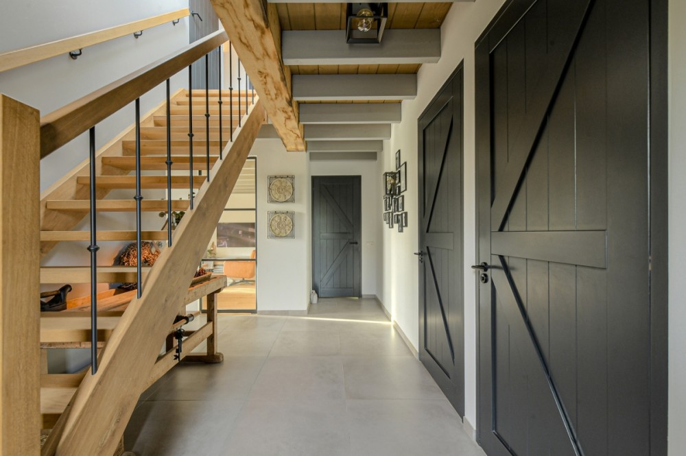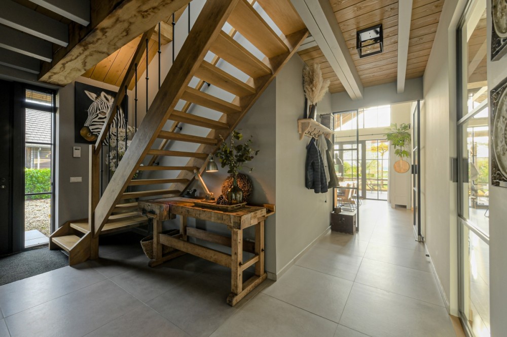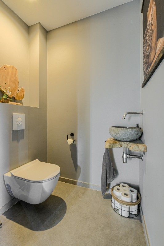 De royale hal biedt toegang tot de trap naar de eerste verdieping, de meterkast, de moderne badkamer, het separate hangcloset met fonteintje, de slaapkamer met inloopkast, de open woonkeuken en de lichte living. De gehele begane grond is hoogwaardig afgewerkt met kwaliteitsvloeren en strak stucwerk op de wanden, en taatsdeuren, wat direct een verzorgde en luxe indruk geeft.