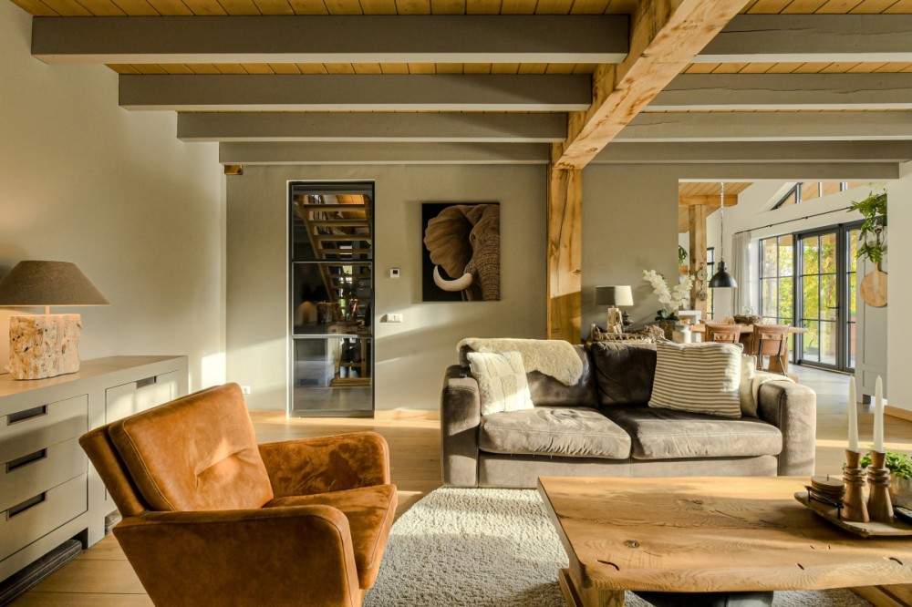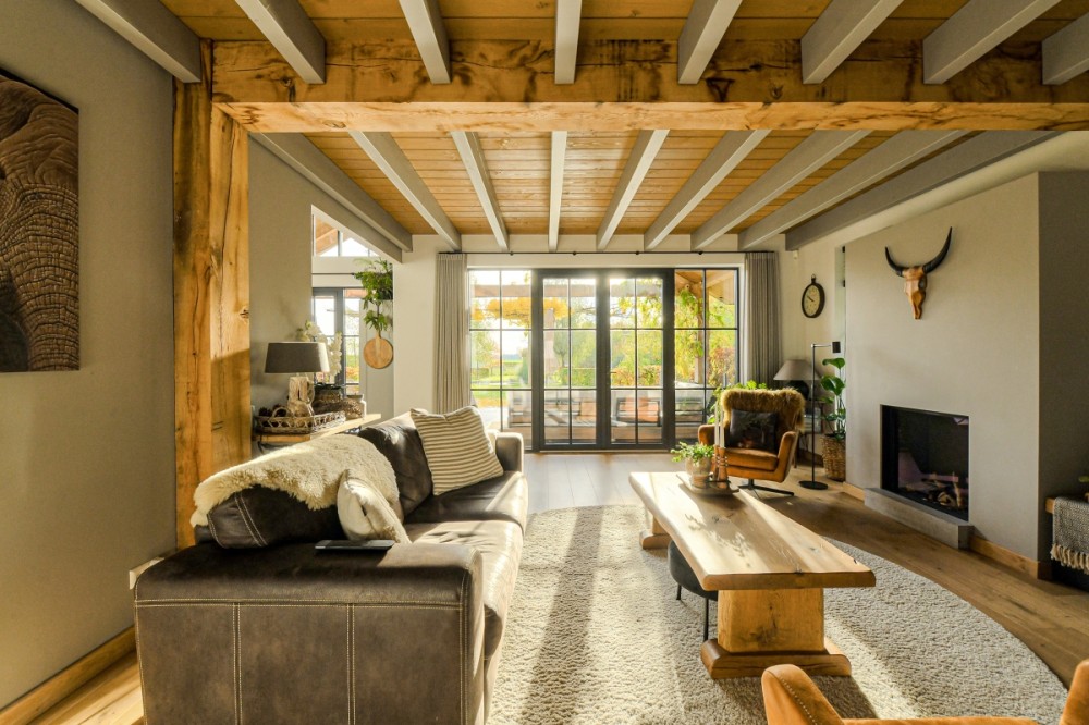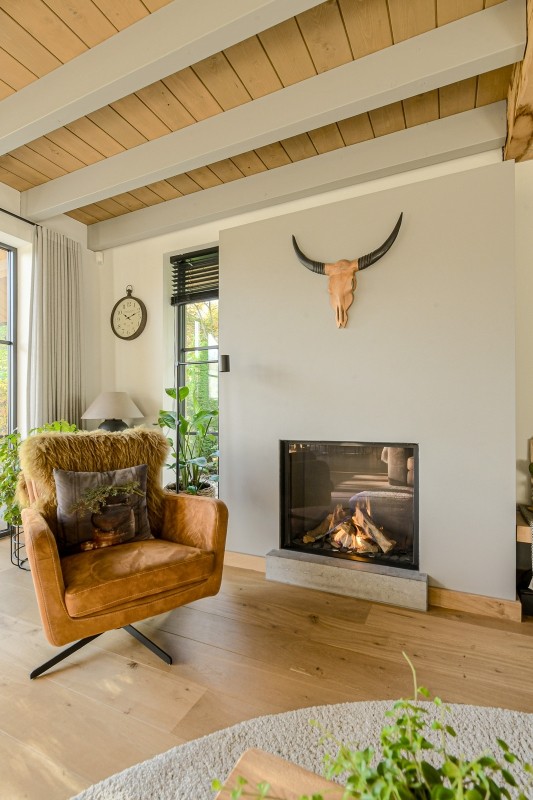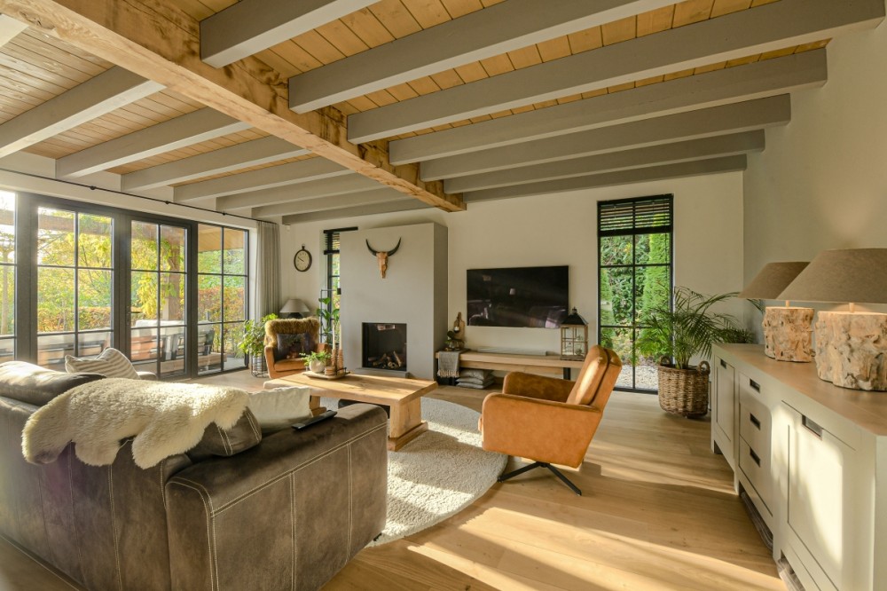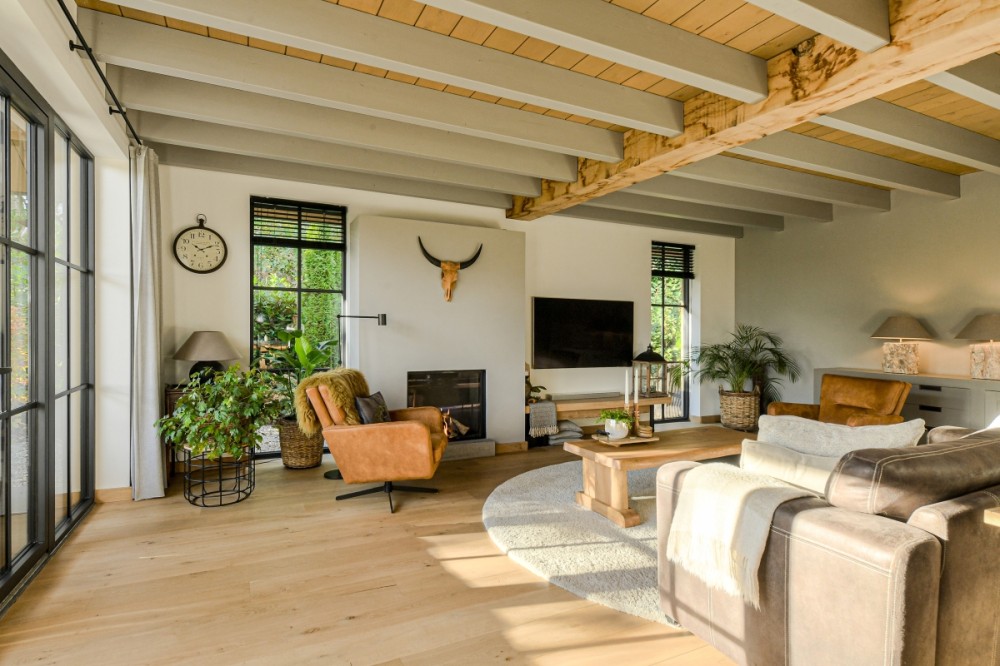 De sfeervolle woonkamer ademt warmte en karakter. De ingebouwde propaangashaard vormt een prachtig middelpunt en zorgt voor een warme sfeer tijdens alle seizoenen. De houten vloer, strak gestuukte wanden en de indrukwekkende eiken gebinten geven de ruimte een tijdloze, landelijke uitstraling. De woonkamer staat in open verbinding met de woonkeuken, waardoor een fijn gevoel van ruimte en verbondenheid ontstaat. Via de openslaande deuren loopt de living naadloos over in de tuin, waardoor binnen en buiten op een natuurlijke manier samensmelten.