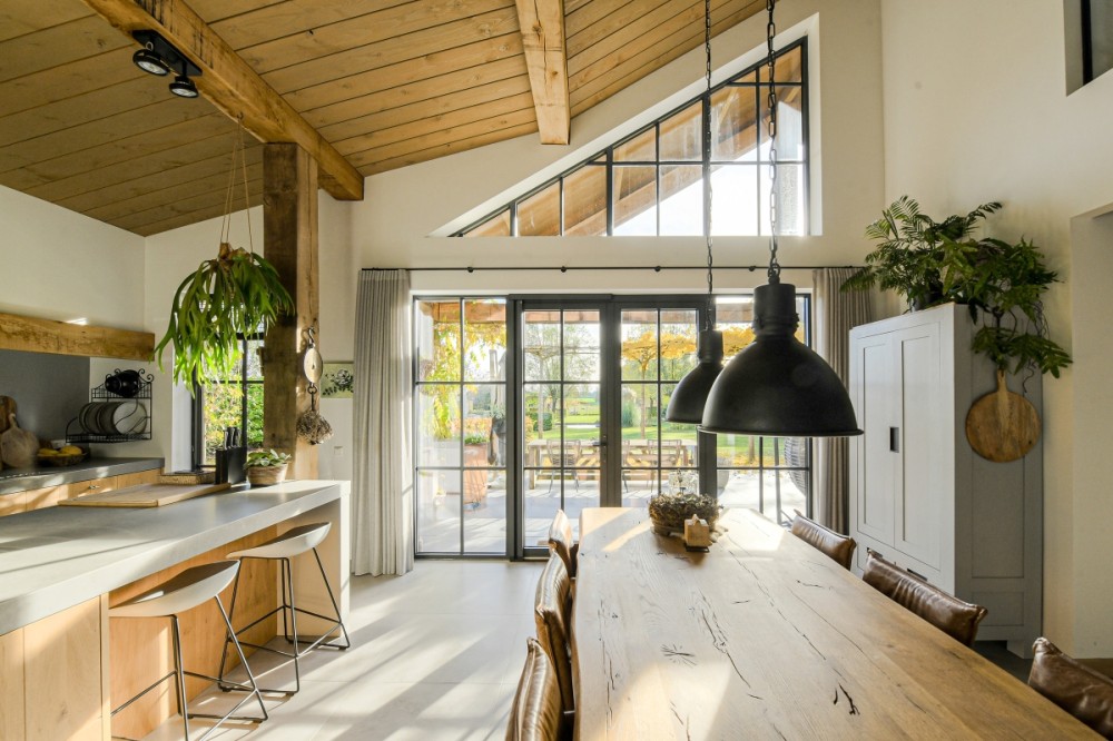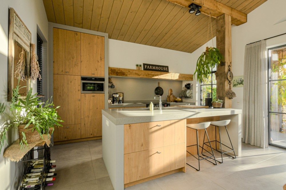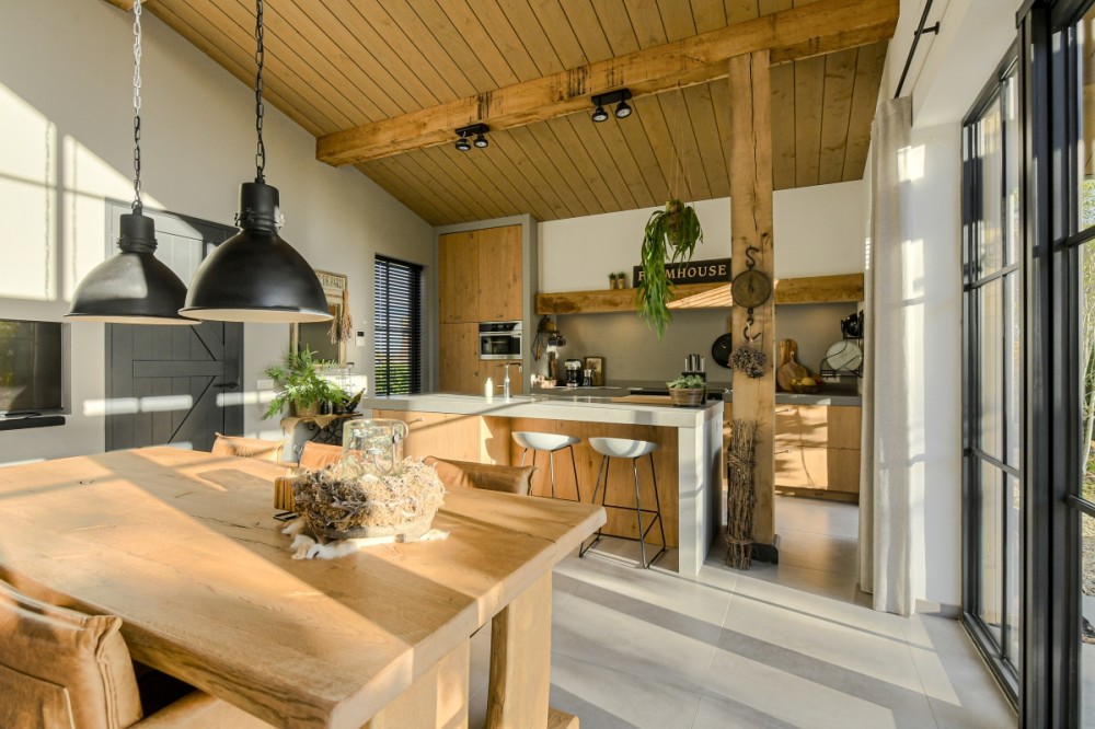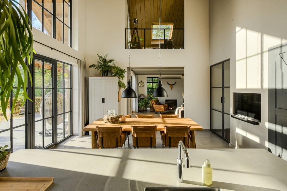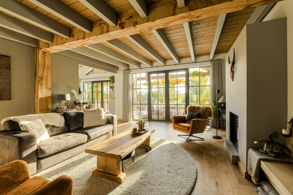 De sfeervolle woonkamer ademt warmte en karakter. De ingebouwde propaangashaard vormt een prachtig middelpunt en zorgt voor een warme sfeer tijdens alle seizoenen. De houten vloer, strak gestuukte wanden en de indrukwekkende eiken gebinten geven de ruimte een tijdloze, landelijke uitstraling. De woonkamer staat in open verbinding met de woonkeuken, waardoor een fijn gevoel van ruimte en verbondenheid ontstaat. Via de openslaande deuren loopt de living naadloos over in de tuin, waardoor binnen en buiten op een natuurlijke manier samensmelten.