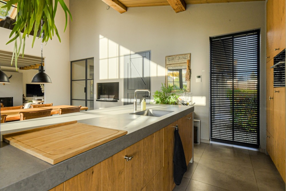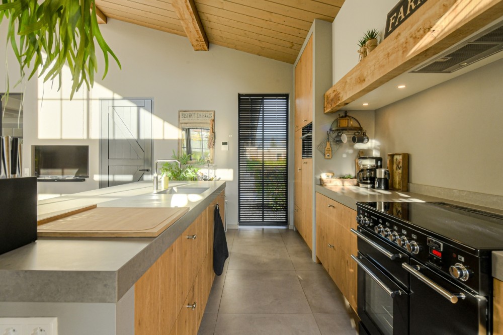 De open woonkeuken is een heerlijke plek om te koken, te tafelen en samen te zijn. Dankzij de grote raampartij met openslaande tuindeuren baadt de ruimte in natuurlijk licht en geniet u continu van het uitzicht op de tuin. De keuken is uitgerust met een stijlvol composieten aanrechtblad in betonlook, een koelkast en een prachtig Infusion-fornuis met inductiekookplaat, grill, hetelucht- én pizzafunctie.