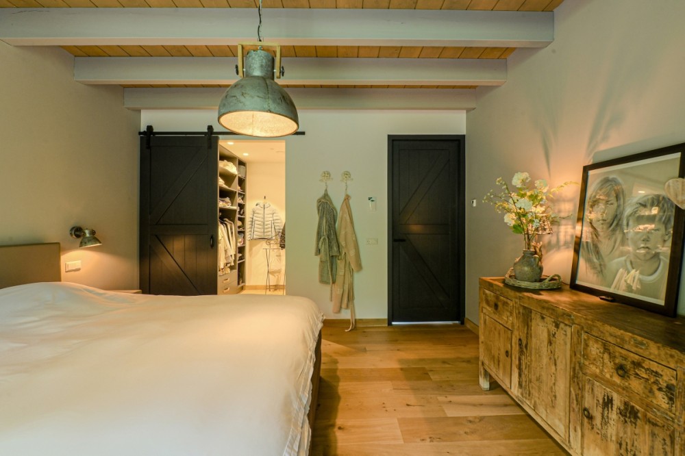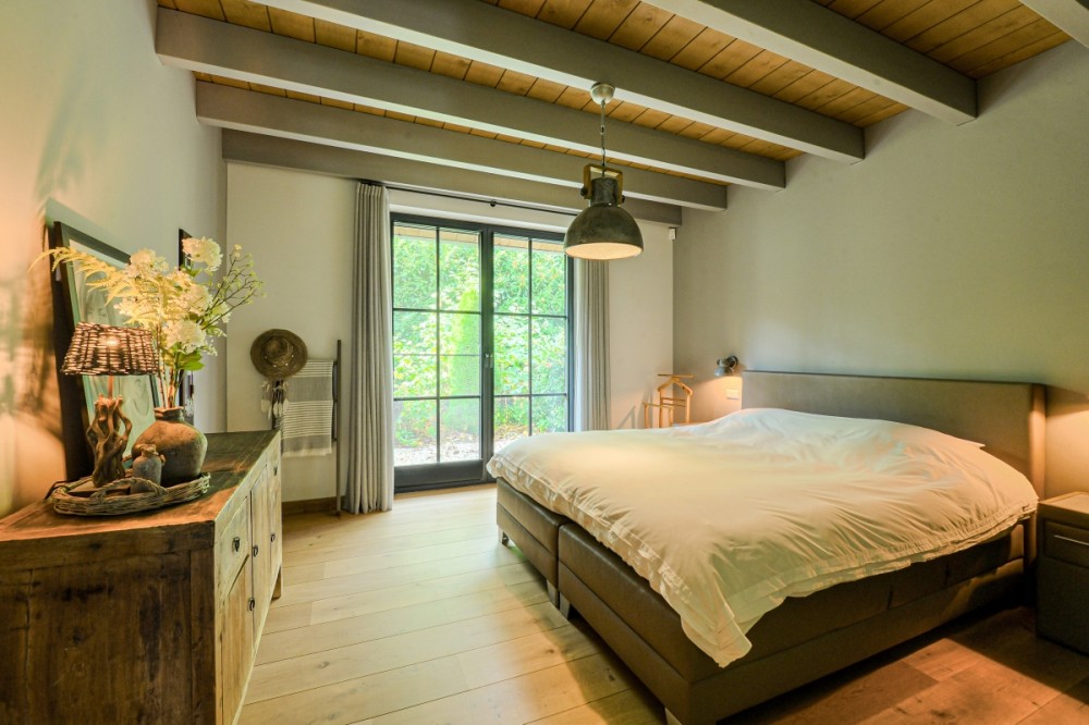 De royale slaapkamer op de begane grond biedt een comfortabele en rustige plek om te ontspannen. De kamer is voorzien van een fraaie houten vloer en beschikt over een ruime inloopkast. De openslaande deuren met hordeur zorgen voor volop licht, frisse lucht en een directe verbinding met de tuin.