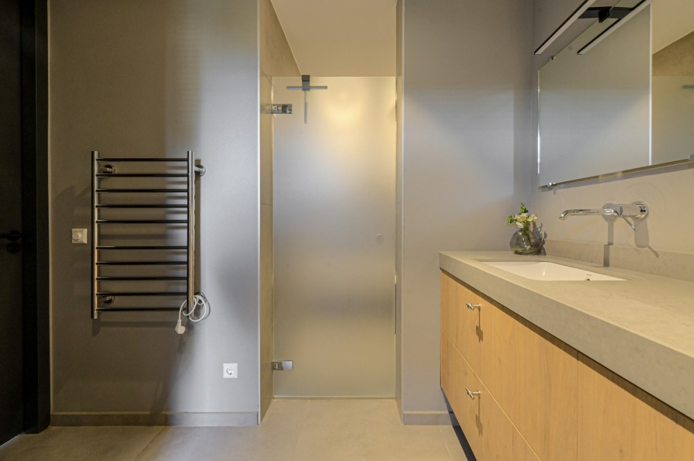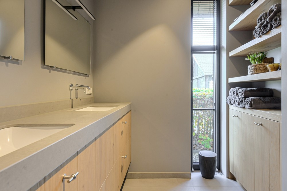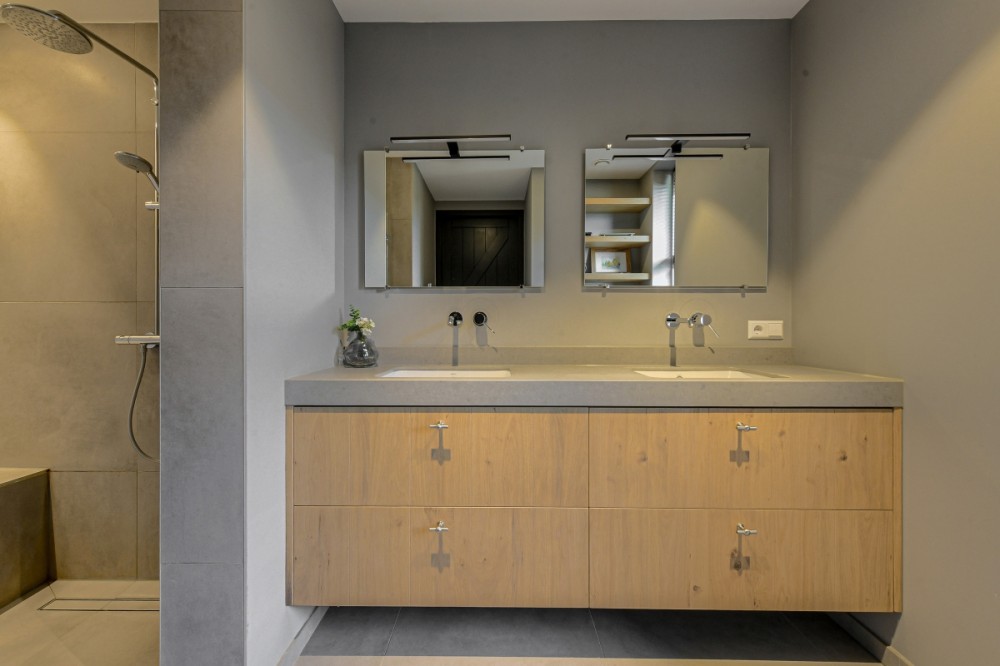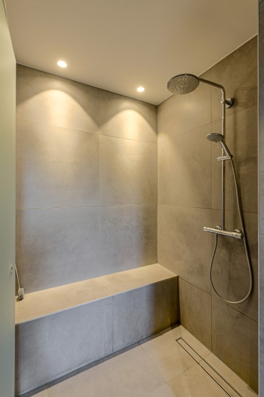 De luxe badkamer is stijlvol afgewerkt met een tegelvloer en straalt comfort en rust uit. De ruime inloopdouche biedt een zitmogelijkheid en is voorzien van zowel een handdouche als een regendouche met mengkraan. Het badkamermeubel met dubbele wastafel sluit volledig aan bij de hoogwaardige stijl van de keuken en zorgt voor een samenhangend, luxe interieur. Voor extra comfort is de elektrische radiator ideaal om handdoeken heerlijk warm te houden.