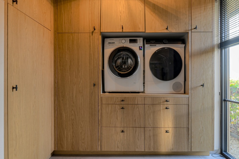 Aansluitend aan de keuken bevindt zich de praktische bijkeuken, waar ruimte is voor de vriezer, wasmachine en droger. Daarnaast biedt deze bijkeuken volop opbergmogelijkheden, ideaal voor voorraad.