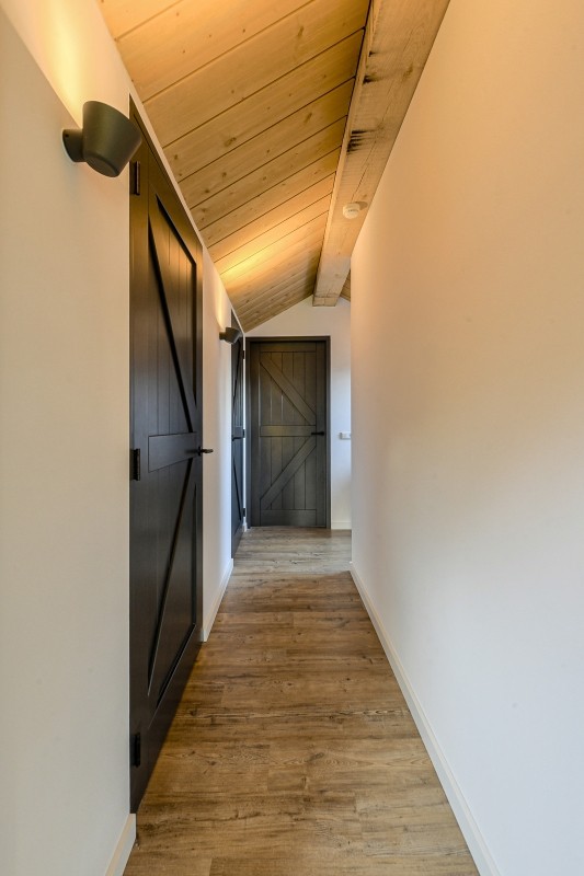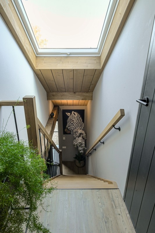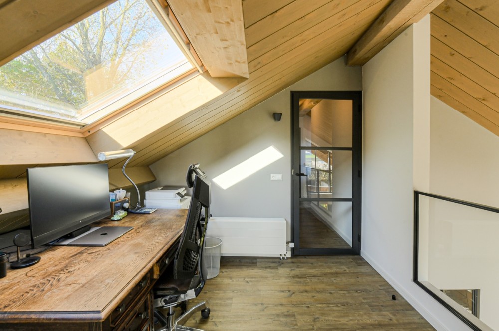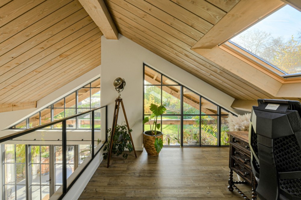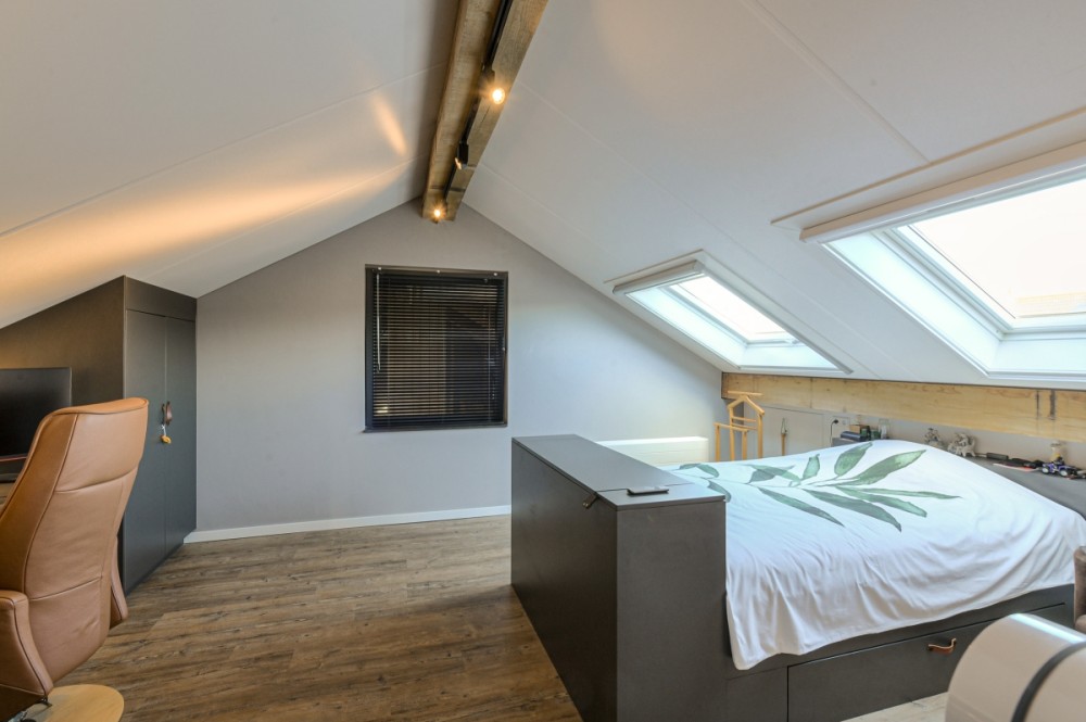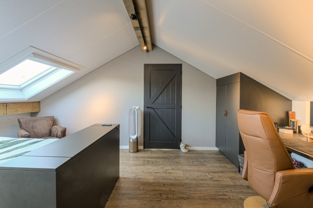 Aan de achterzijde bevindt zich nog een sfeervolle en lichte slaap- of werkruimte, met een hoog oplopend houten plafond en grote raampartijen die een prachtig uitzicht op de tuin bieden. Eén zijde van de verdieping staat open, waardoor u vrij uitkijkt over de woonkeuken beneden. Deze open verbinding, gecombineerd met de warme vloer, geeft de ruimte een bijzonder ruimtelijk gevoel en ademt een luxe, rustige sfeer.