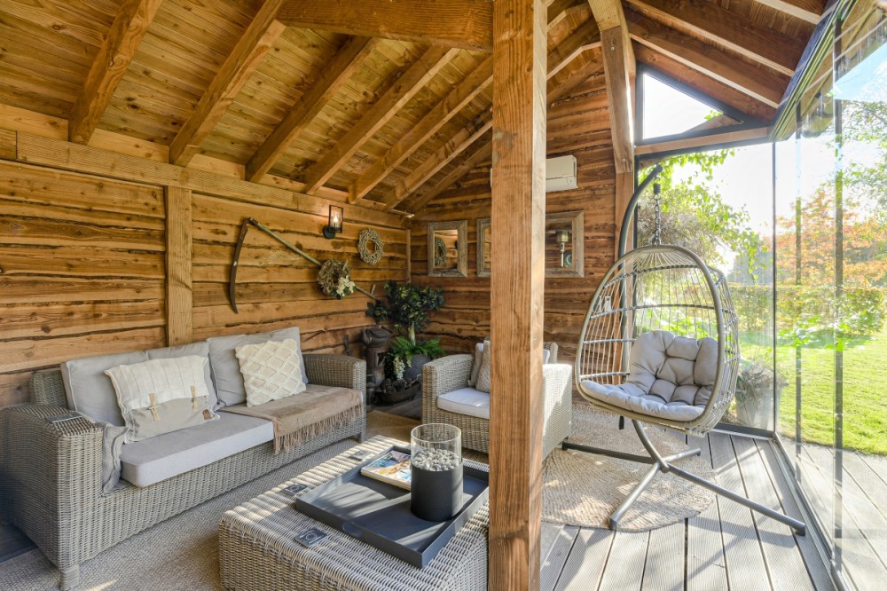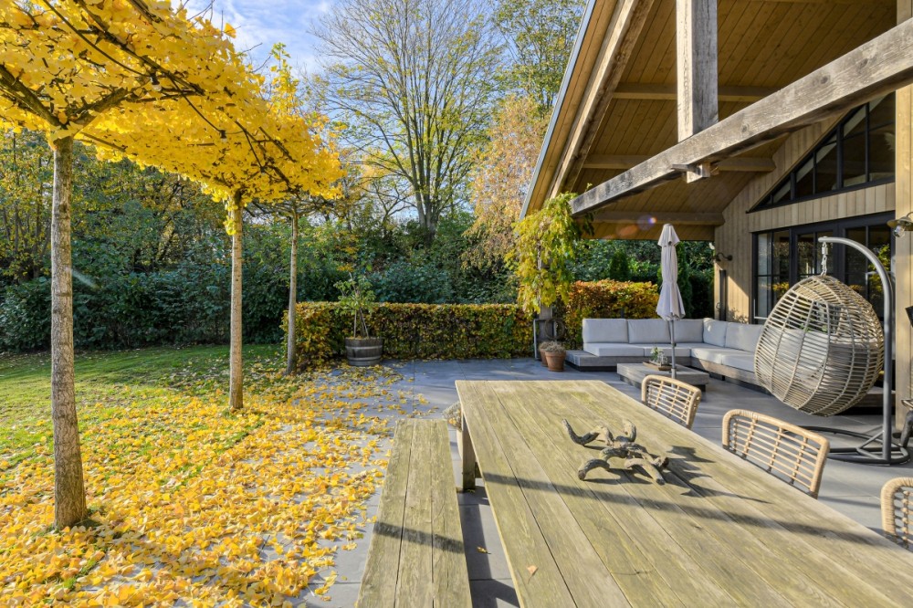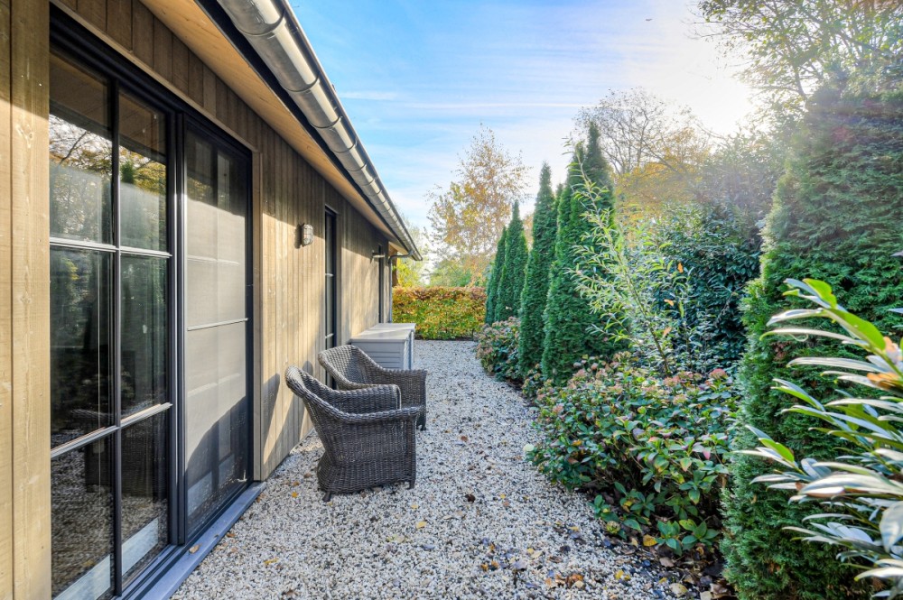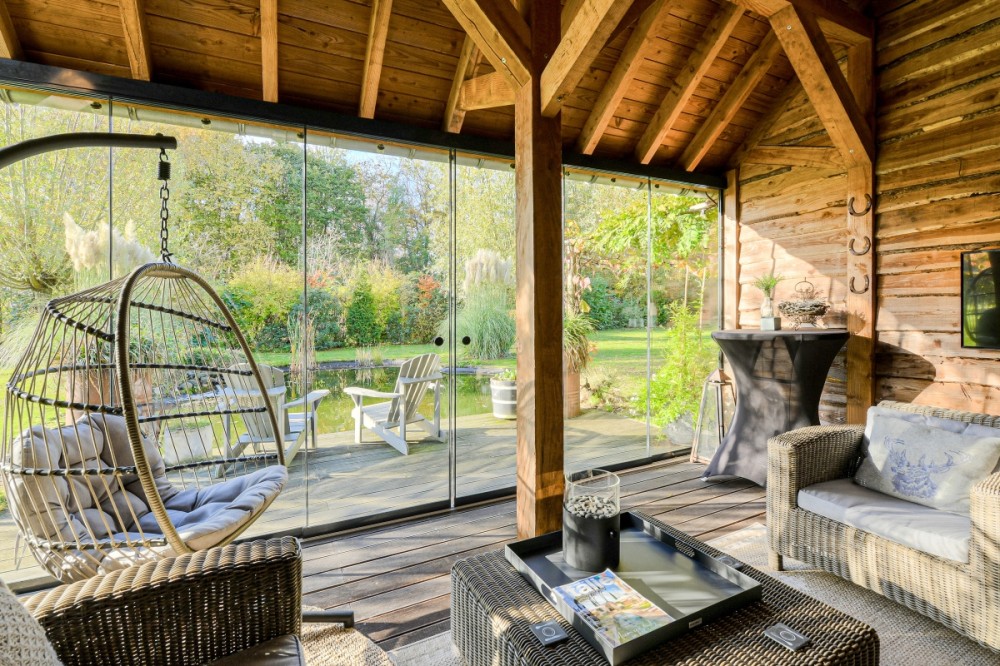 Dankzij de overdekte zithoek, voorzien van comfortabele loungeplekken en af te sluiten glazen schuifpanelen, kunt u hier het hele jaar door van het buitenleven genieten. Vanuit deze fijne plek heeft u een prachtig uitzicht over de vijver en de omliggende natuur, waardoor de tuin een ware oase van rust en ontspanning vormt.