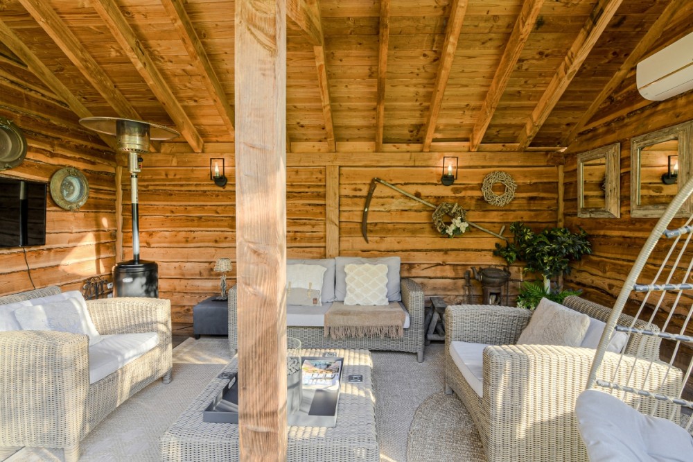 In de prachtig aangelegde tuin bevindt zich een sfeervol tuinhuis, grenzend aan een praktische berging. Het tuinhuis is volledig uitgevoerd in Douglas hout en beschikt over internet, stroom, verlichting en een airco voor zowel verwarming als koeling.