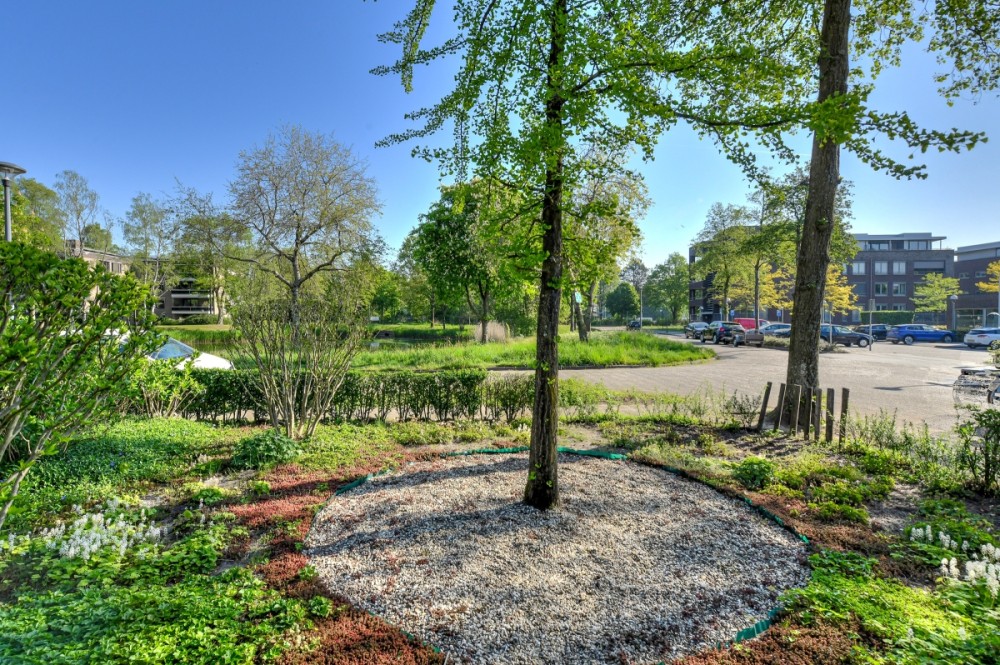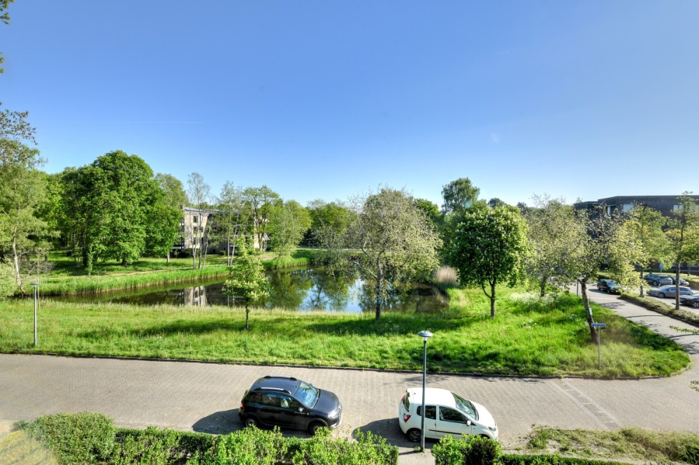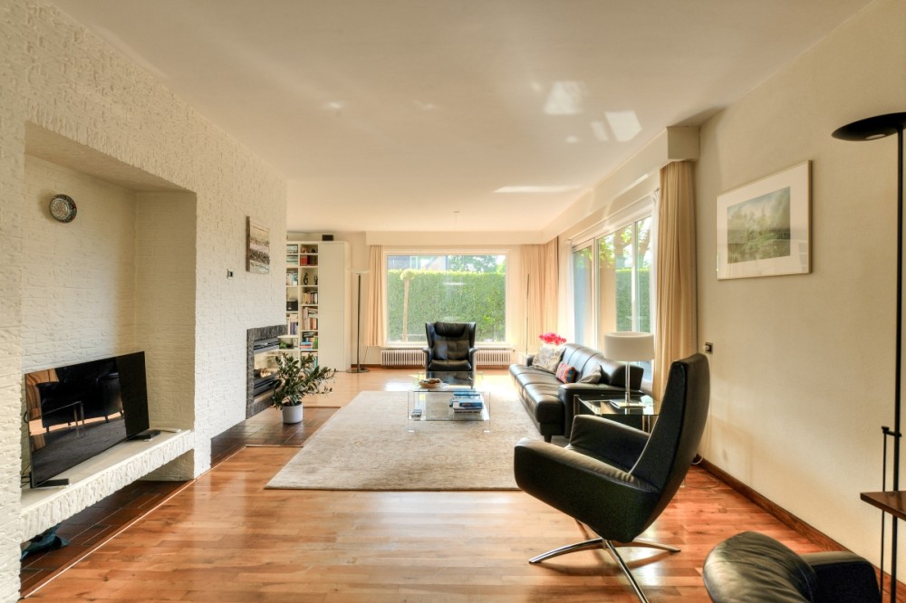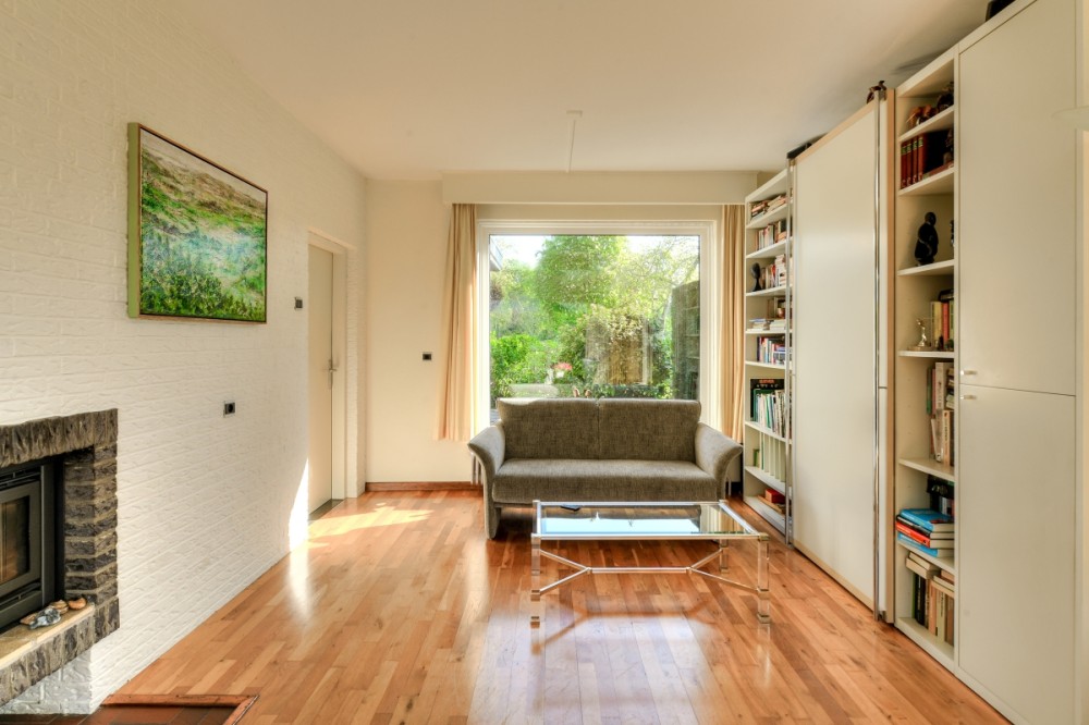 L-vorige living (ca. 8.06 x 7.05m.) met parketvloer, schouw met inzethaard, tv-nis en een fraai uitzicht over zowel de voor- als achtertuin. De voortuin kijkt uit op een vijver welke in verbinding met een parkje staat. Via doorloop is de eetkame bereikbaar.