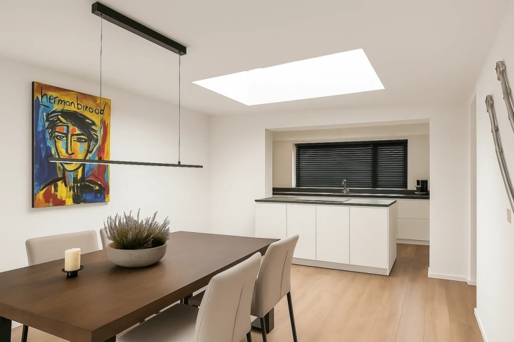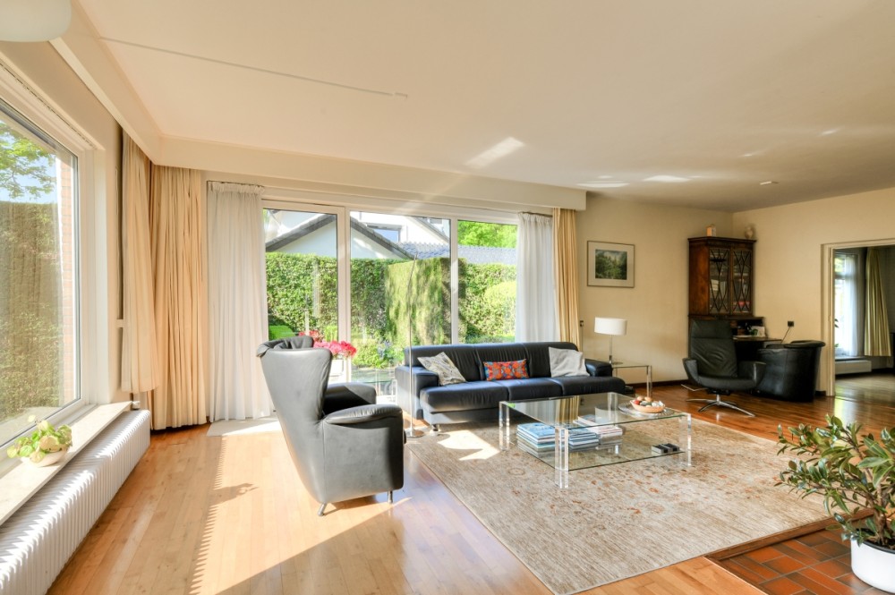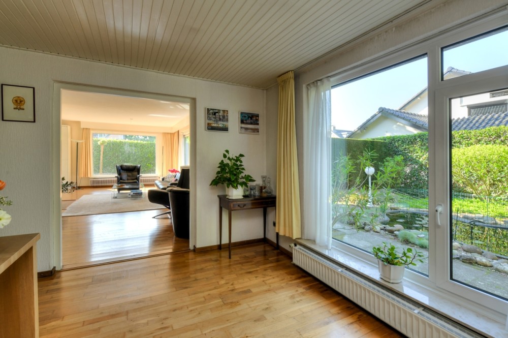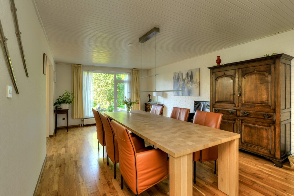 De royale eetkamer (ca. 7.05 x 3.84m.) is tevens v.v. een parketvloer en kijkt uit over de sfeervol ingerichte achtertuin met prieel, vijver en blijvend goene perceelsafscheiding.