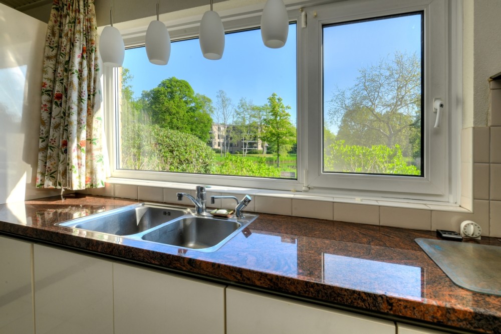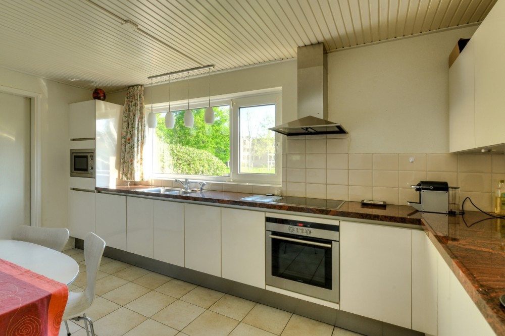 De woonkeuken met plavuizen vloer heeft een L-vormige keukenopstelling, natuurstenen aanrechtblad en voorzien van diverse inbouwapparatuur, te weten: elektrische kookplaat, RVS afzuigkap, Quooker, oven, vaatwasser en magnetron. Ook vanuit de keuken een prachtig uitzicht op de voortuin en parkvijver.