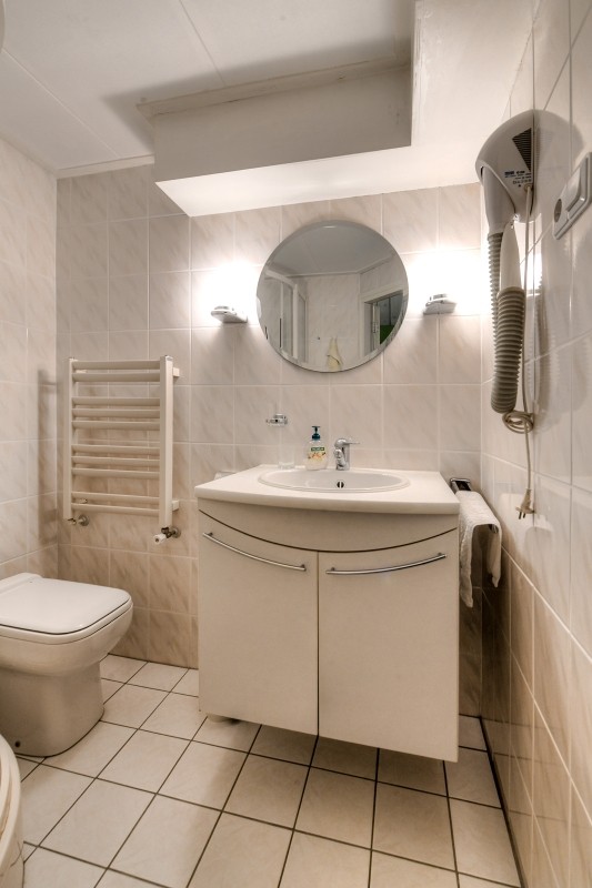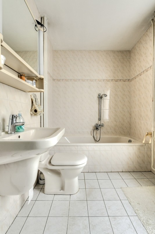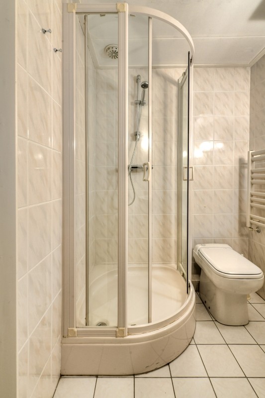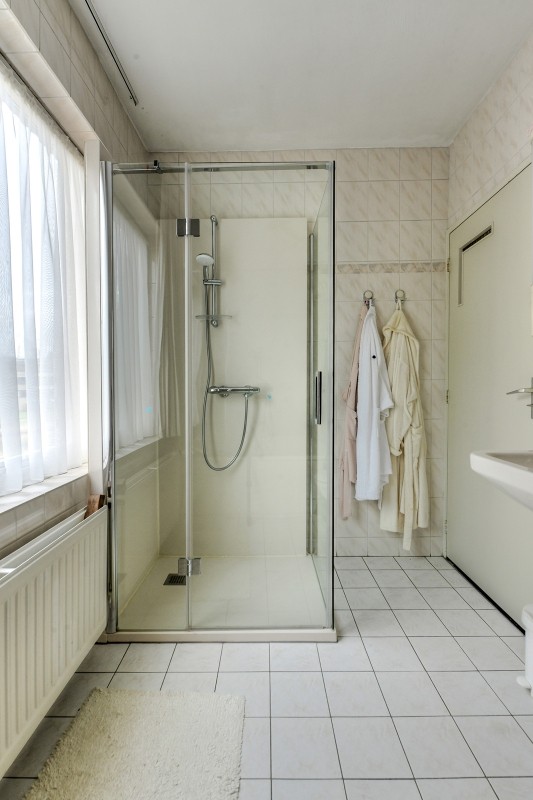 Betegelde badkamer (ca. 3.08 x 1.91m.) uitgerust met ligbad, aparte douche met glazen deur, wastafel en 2e toilet.