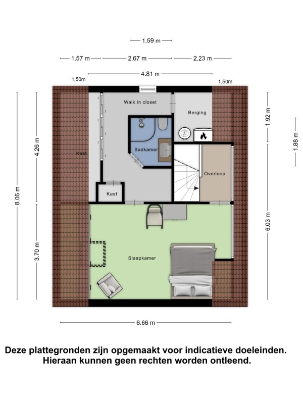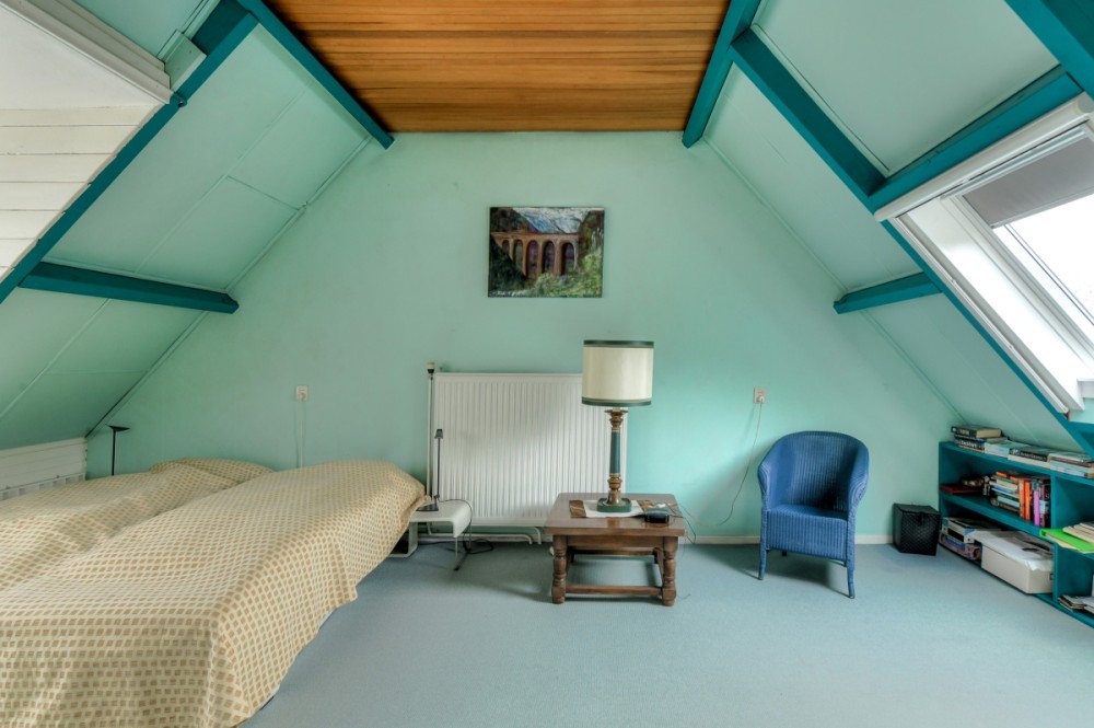 Middels vaste trap komt u op de voorzolder die u toegang geeft tot de slaapkamer (ca. 6.66 x 3.70m.) met dakkapel, Velux dakraam en bergruimte achter de knieschotten. Vanuit de slaapkamer is de walk in closet bereikbaar met veel kastruimte. Tevens is po deze verdieping een geheel betegelde doucheruimte met douche, wastafelmeubel en 3e toilet. Aparte kast met opstelplaats van de CV-unt.