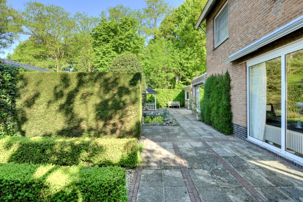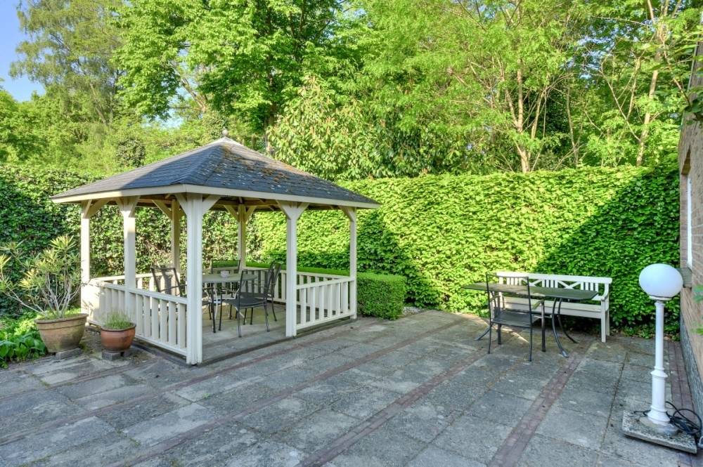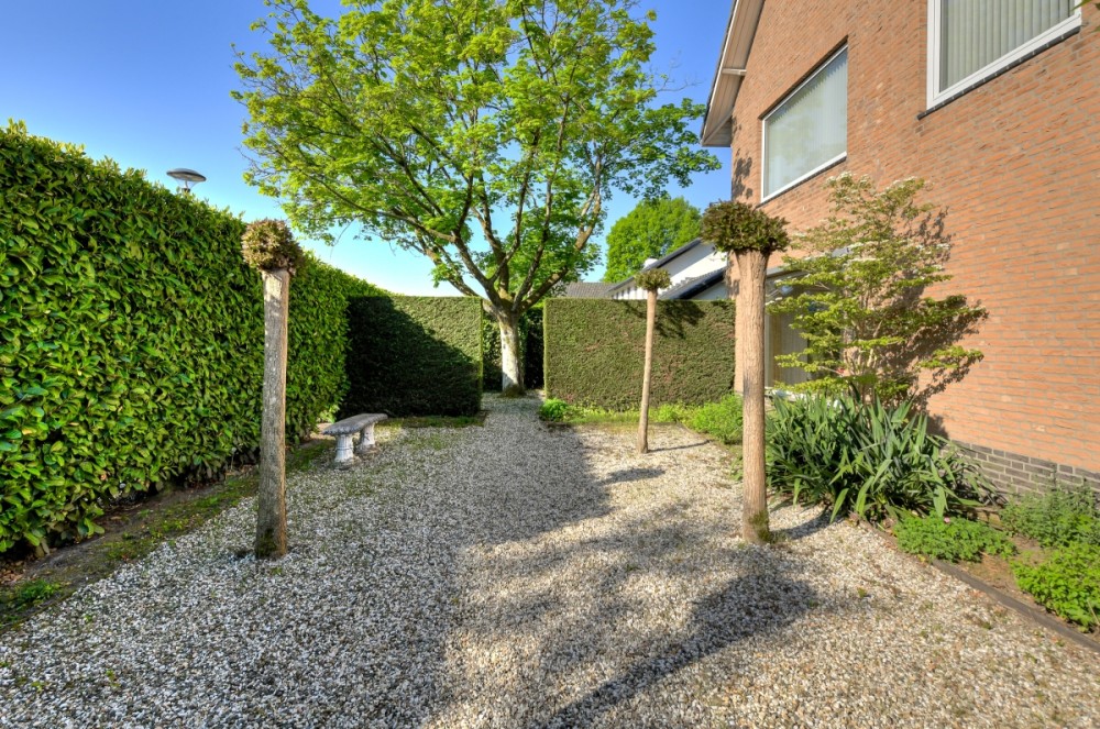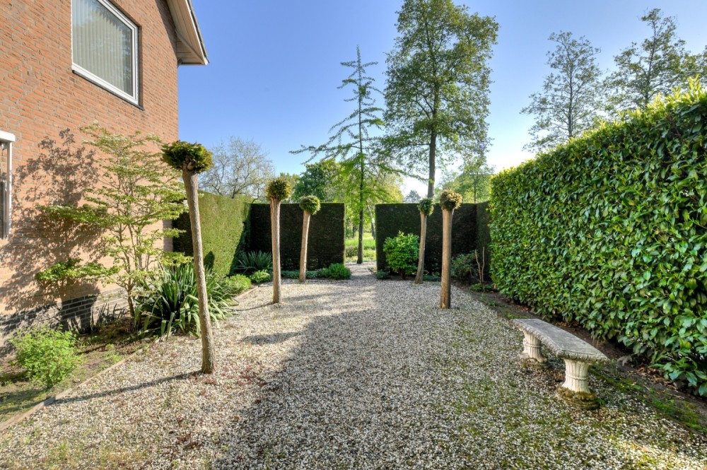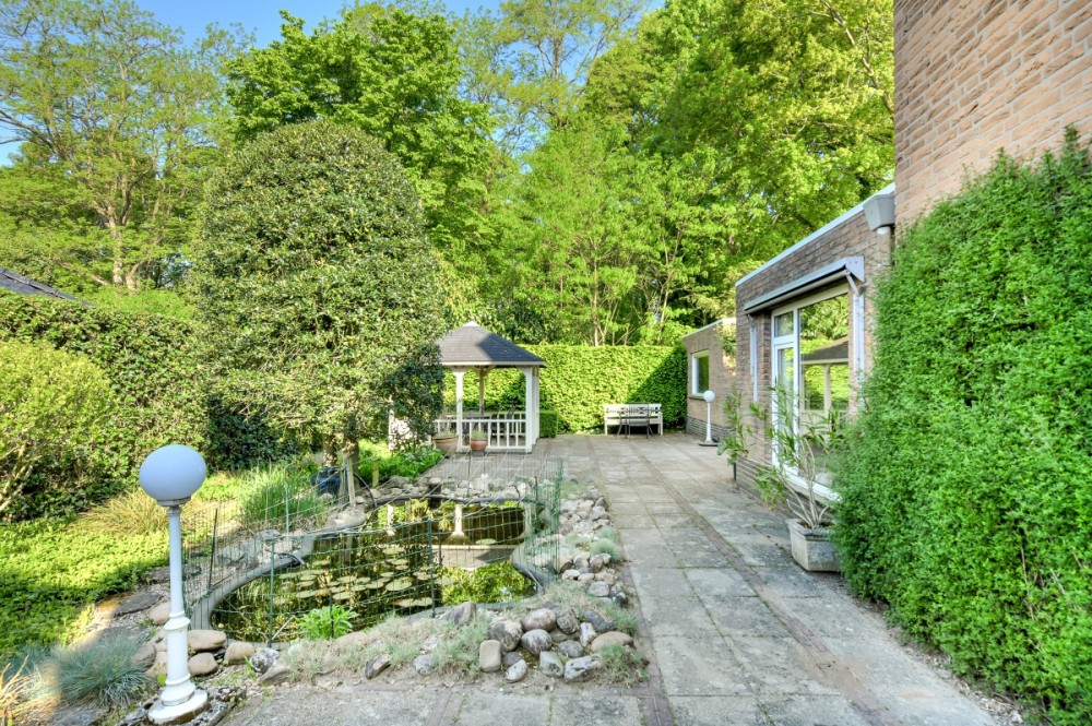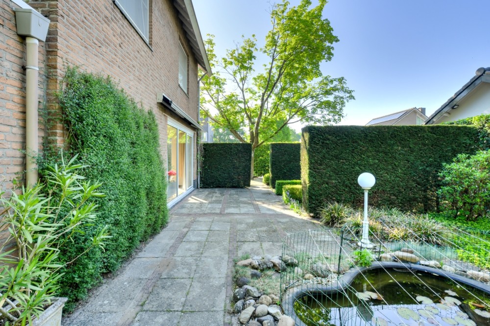 Het pand is voorzien van een losstaande, in spouw opgetrokken, garage/berging afmeting circa 6.59 x 4.15 m. voorzien van een elektrisch bedienbare segmentdeur. Er is een extra poort die is gelegen tussen de garage en het woonhuis. Brede oprit met plaats voor meerdere auto's en een royale voor- en zijtuin. De achtertuin met prieel, diverse terrassen en vijver is gelegen op de zuid-west zijde, dus zeer aantrekkelijk wat de zonligging betreft.