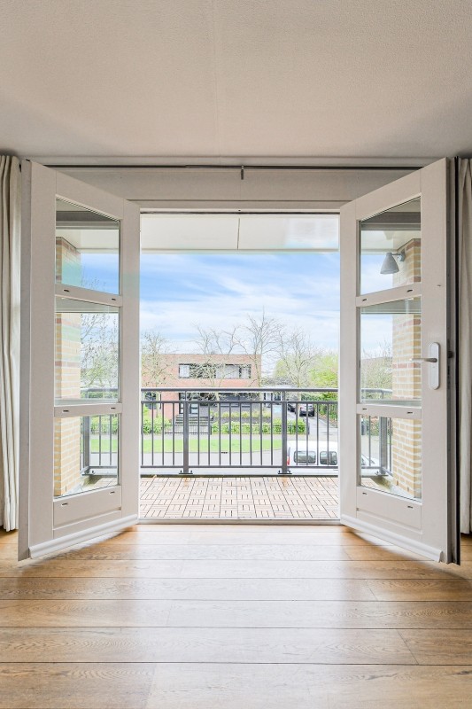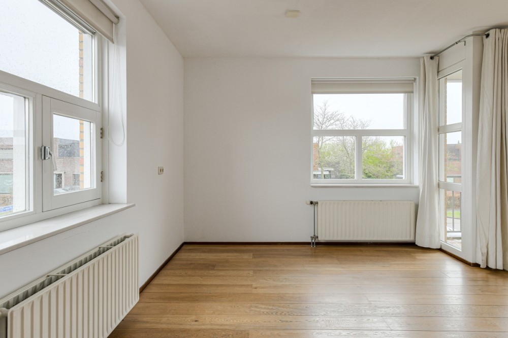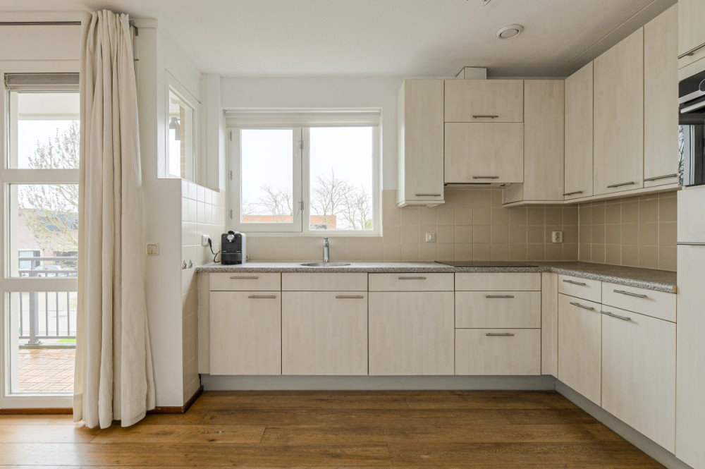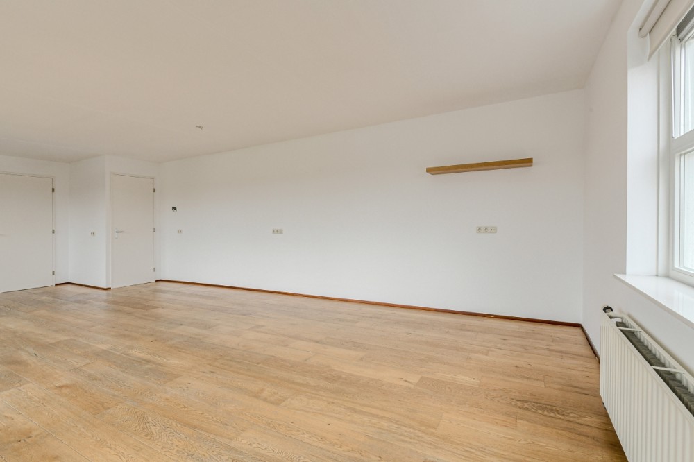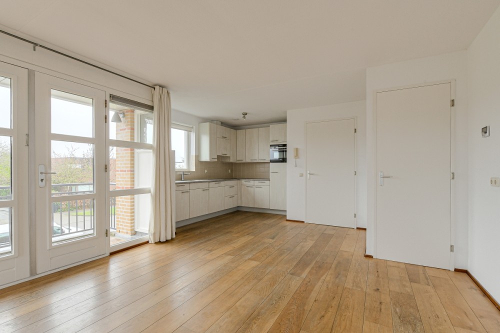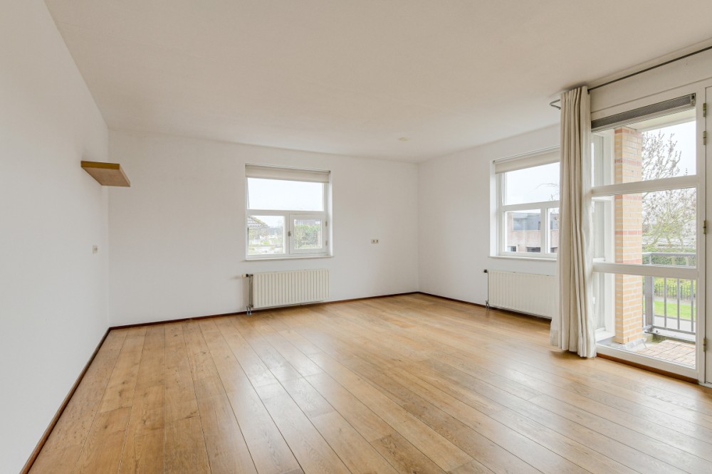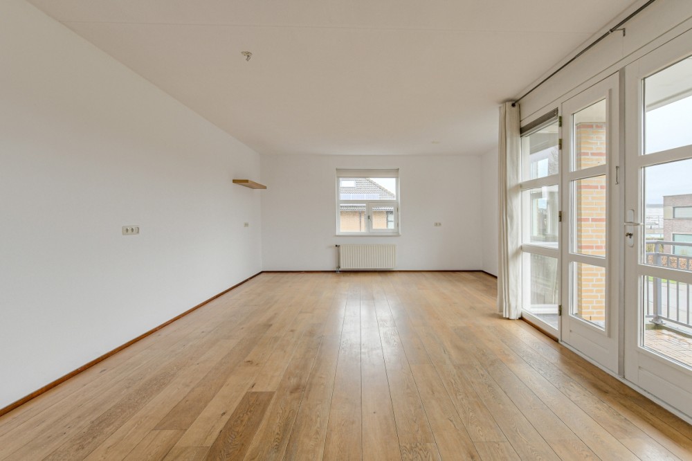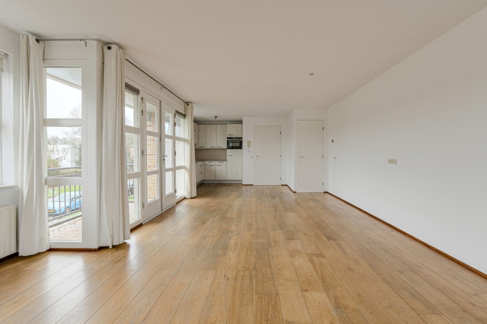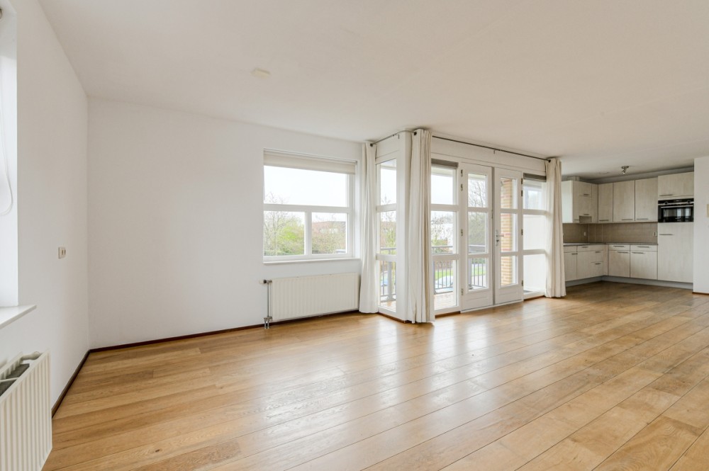 Royale, lichte woonkamer, afm. ca. 40m² met houtenvloer, open keuken, diepe trapkast en toegang middels openslaande tuindeuren naar balkon met houten vlonders.