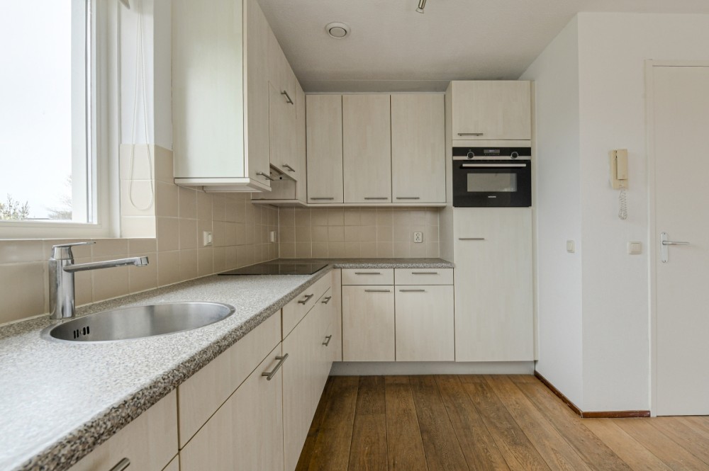 De open keuken beschikt over een nette keukeninrichting in L opstelling welke is voorzien van diverse inbouwapparatuur, te weten; vaatwasser (2022), combi oven-magnetron (2022), koelkast (2022), inductiekookplaat (2019) en afzuigkap.