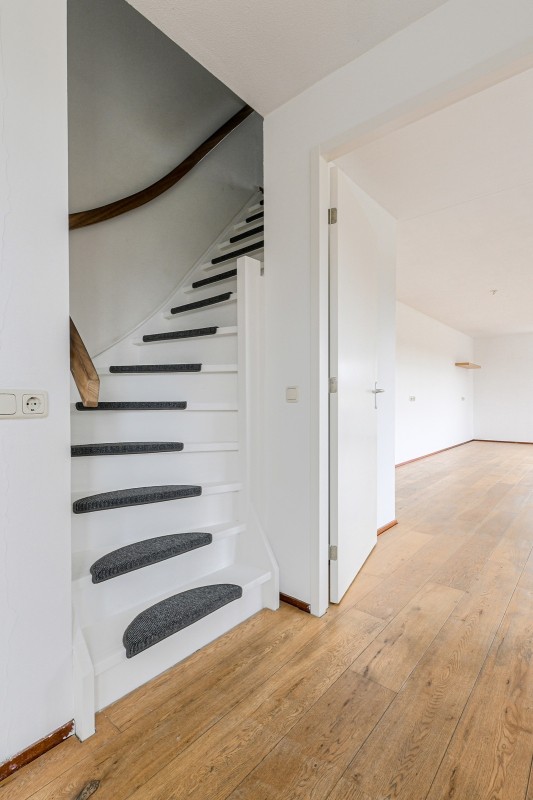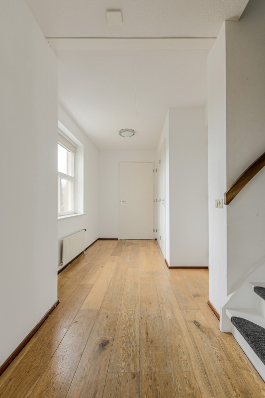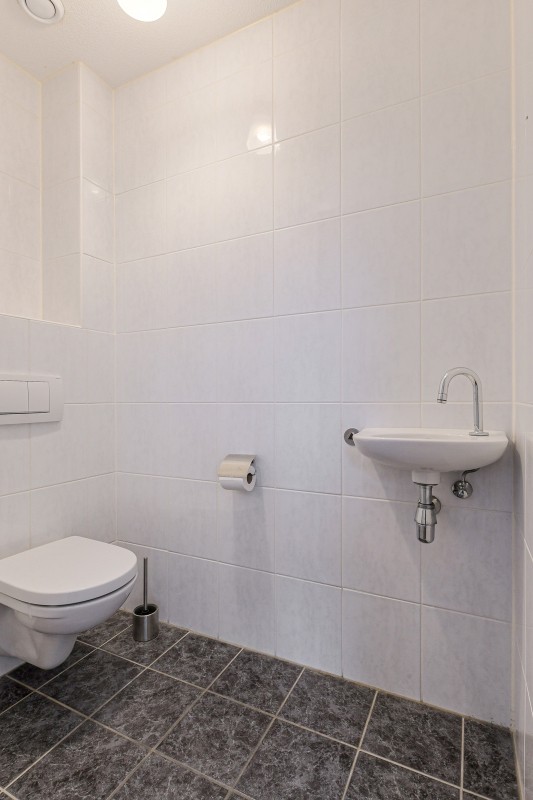 Ruime entree/ hal met houtenvloer, garderobekast, meterkast, trapkast, trapopgang naar 2e verdieping en toegang tot de ruime woonkamer. Volledig betegelde toiletruimte met wandcloset en fonteintje.
