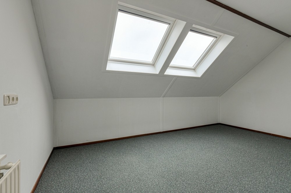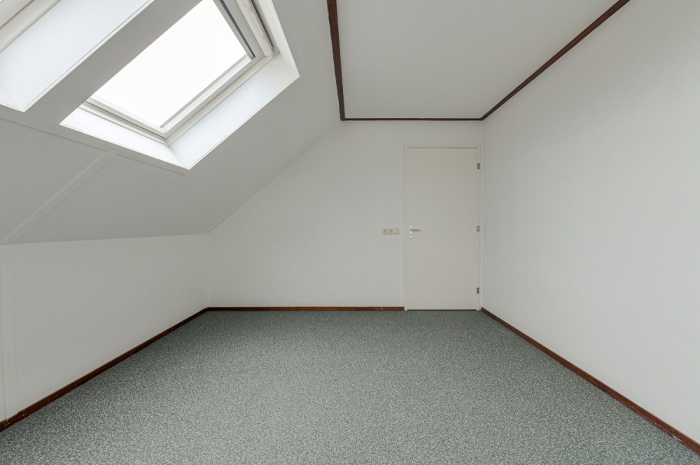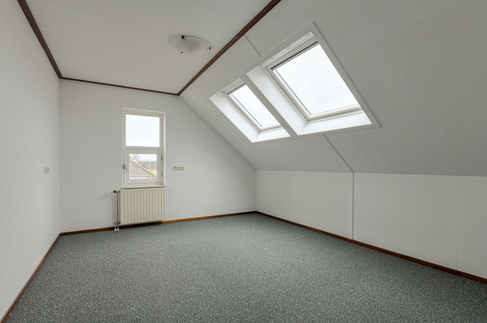 Ruime slaapkamer, afm. ca 15m² met vloerbedekking en 2 Velux dakramen.