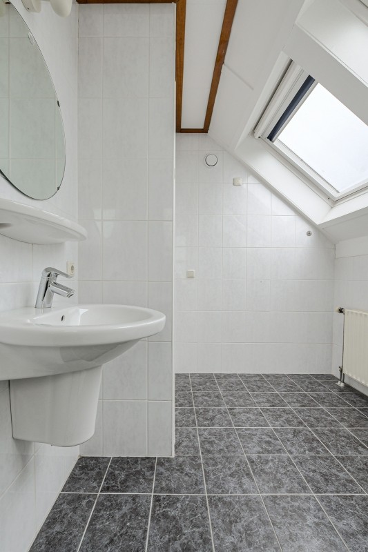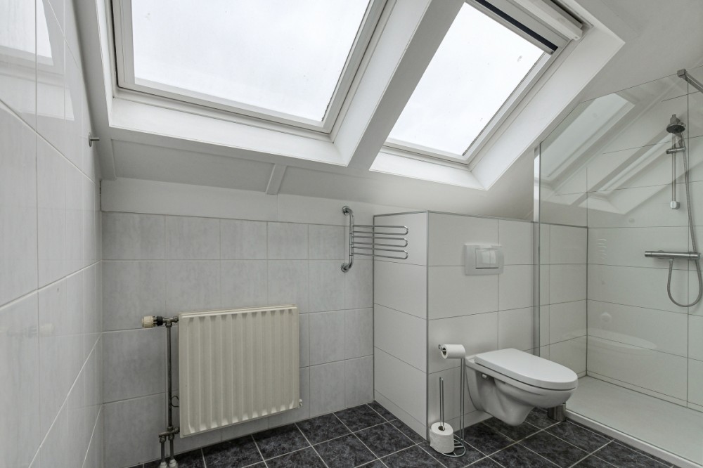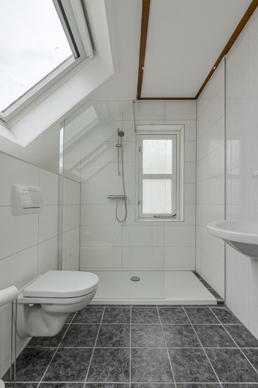 Volledig betegelde badkamer met twee Velux dakramen, inloopdouche, wastafel en tweede hangcloset.