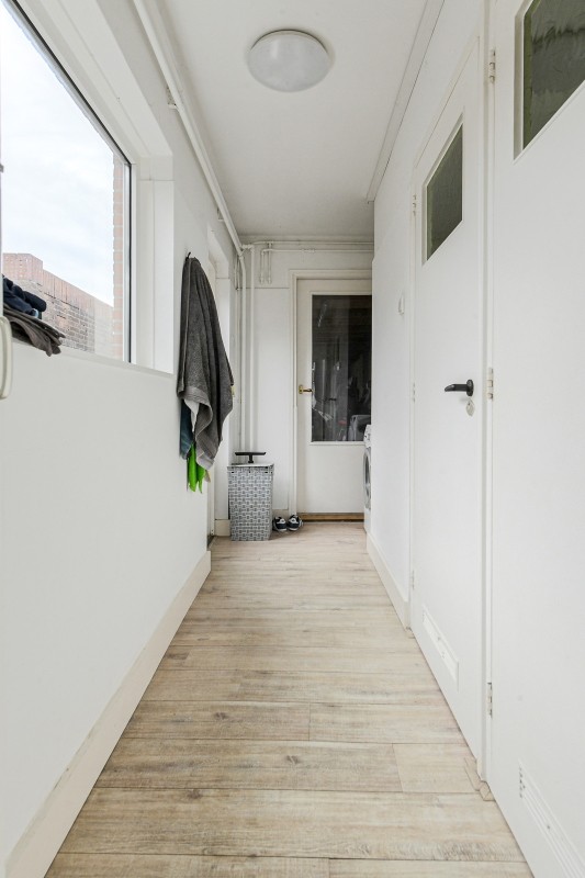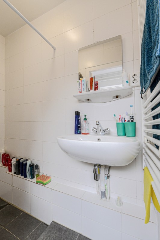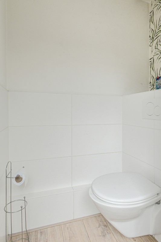 Middels een tussenportaal heeft u toegang tot het toilet met wandcloset en fontein en tot de badkamer welke is voorzien van een inloopdouche, wastafel en designradiator. Het portaal geeft middels een loopdeur toegang tot de achtertuin en tot de riante berging.