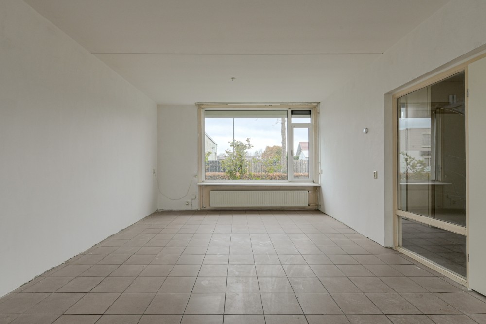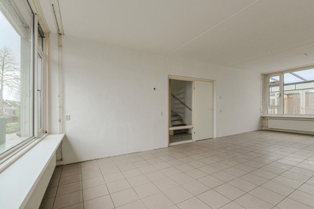 Woon/eetkamer afmeting circa 8.13 x 4.03 m, type doorzon met tegelvloer en grote raampartijen aan de voor en achterzijde.