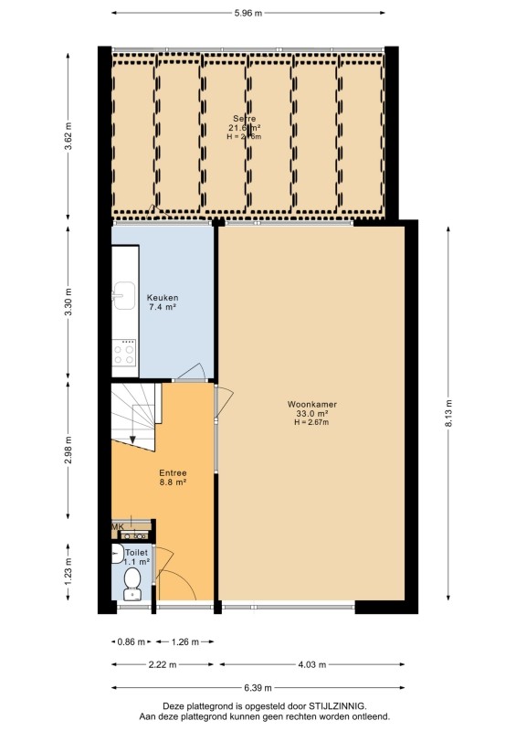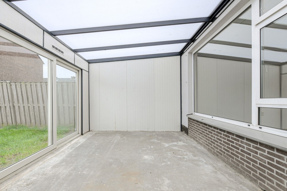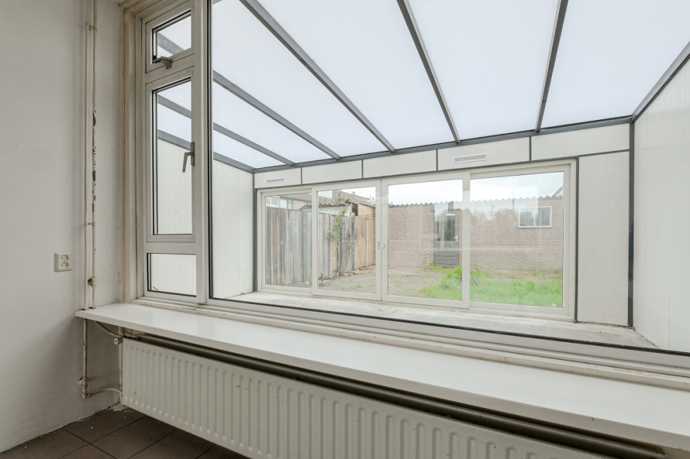 De kunststof serre afm. ca. 3.62 x 5.96m beschikt over een schuifpui welke toegang geeft tot de achtertuin.