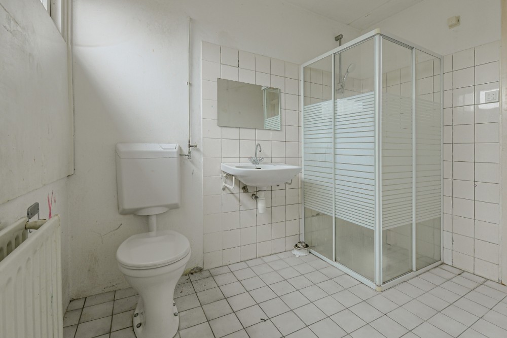 De betegelde badkamer is voorzien van een vaste wastafel, douche en tweede toilet.