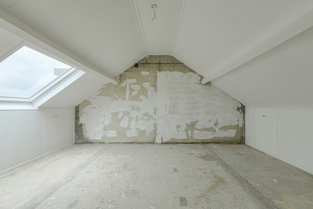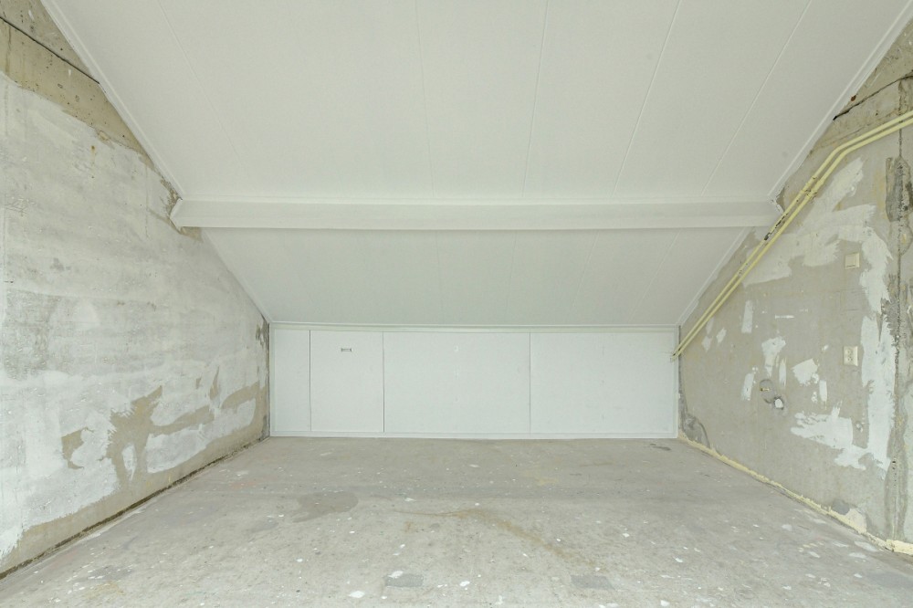 Middels vaste trap toegang tot de voorzolder met voldoende bergruimte en aparte ruimte ten behoeve van de combiketel.