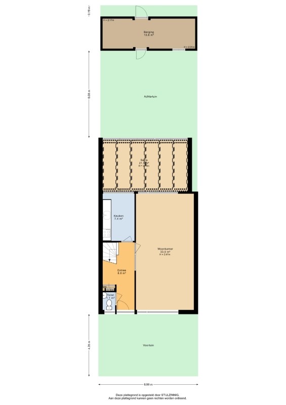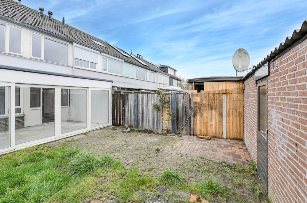 Omsloten tuin met borders en grasveld. Berging over de volle breedte van de tuin. Het pand is voorzien van een achterom door de berging.